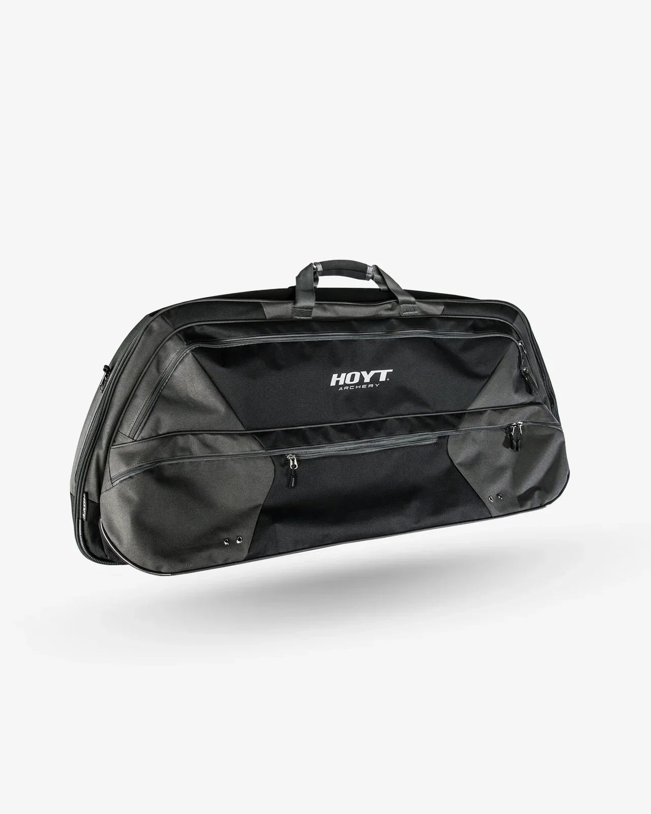 Person organizing pink and white arrows in an archery gear case outdoors on grass