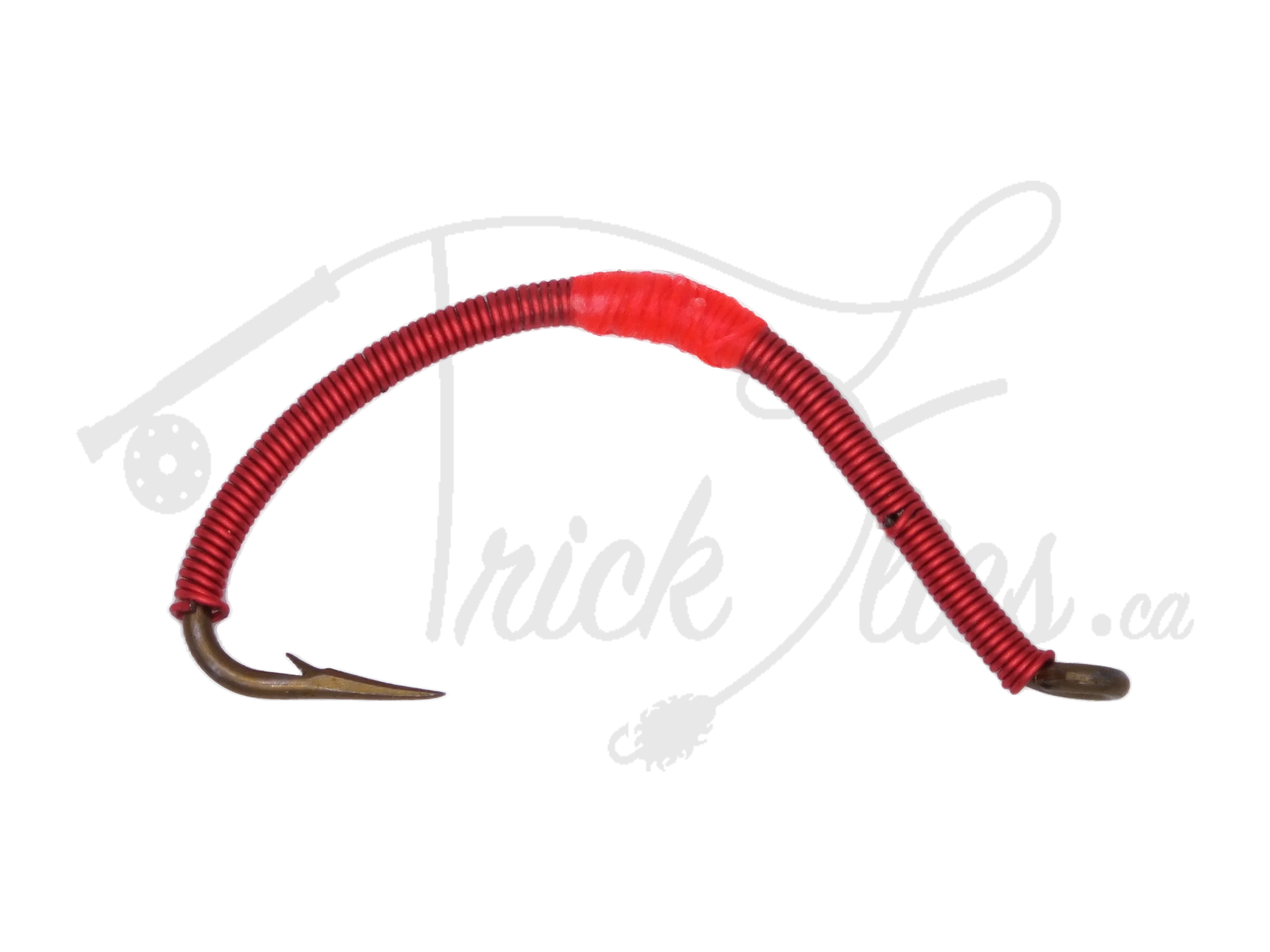 San Juan Worm orange fly fishing lure with curved hook on a white background