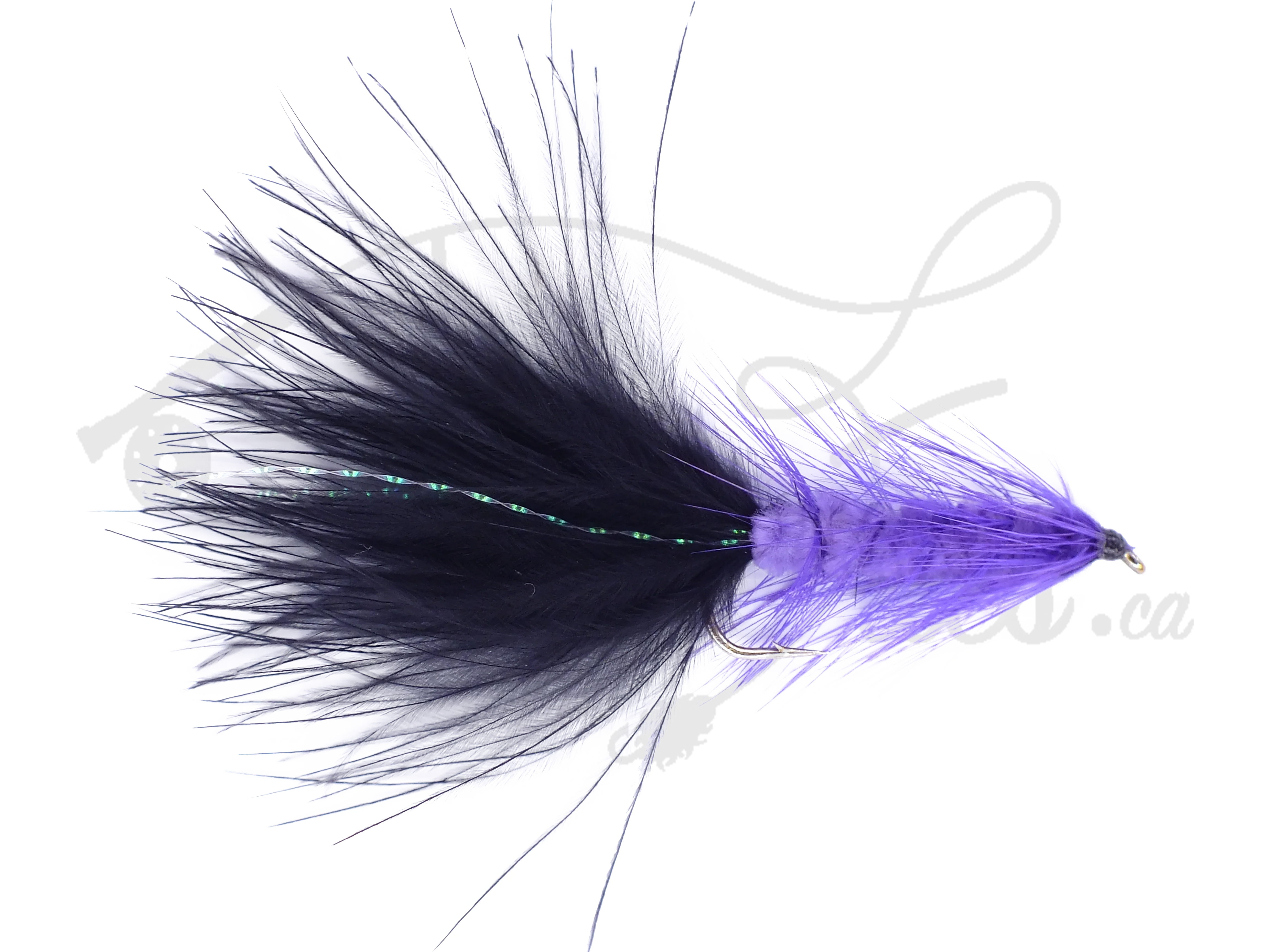 Black and purple tungsten beadhead leech fly fishing lure with marabou and flash.