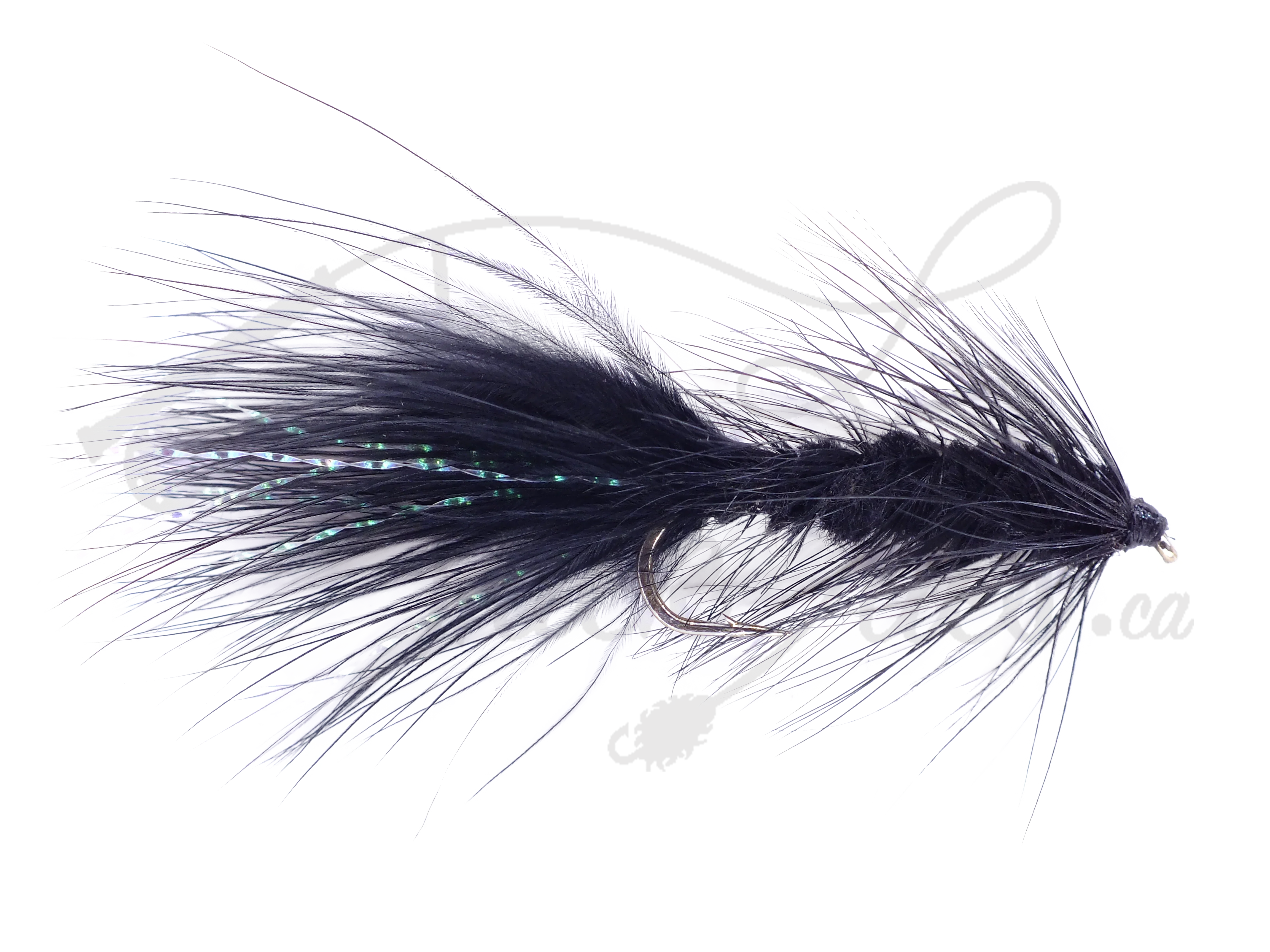 Black Conehead Bow River Bugger fly with gold bead head and feather tail on white background