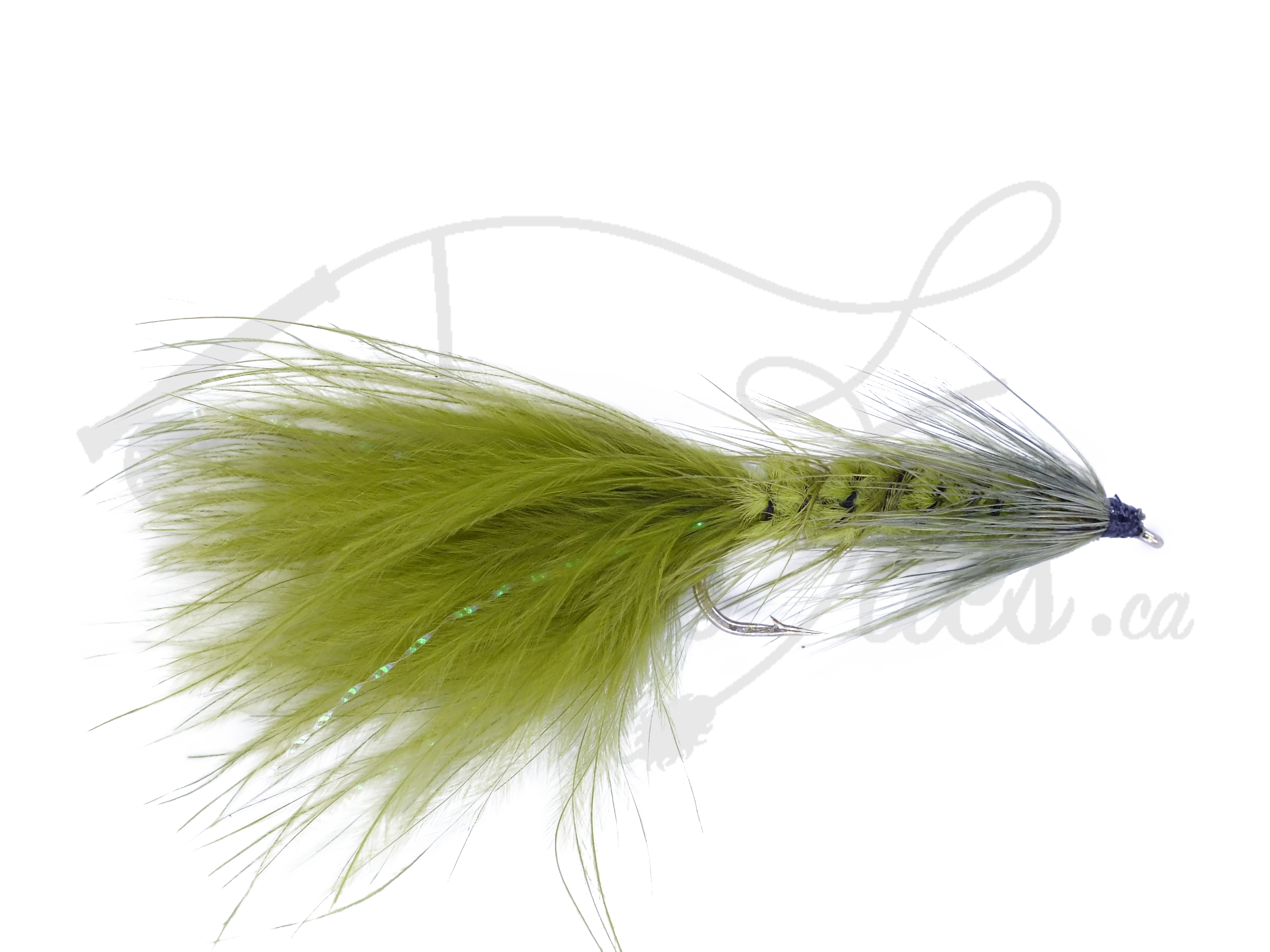 Olive Conehead Bow River Bugger fly fishing lure with gold cone head and bushy feathers