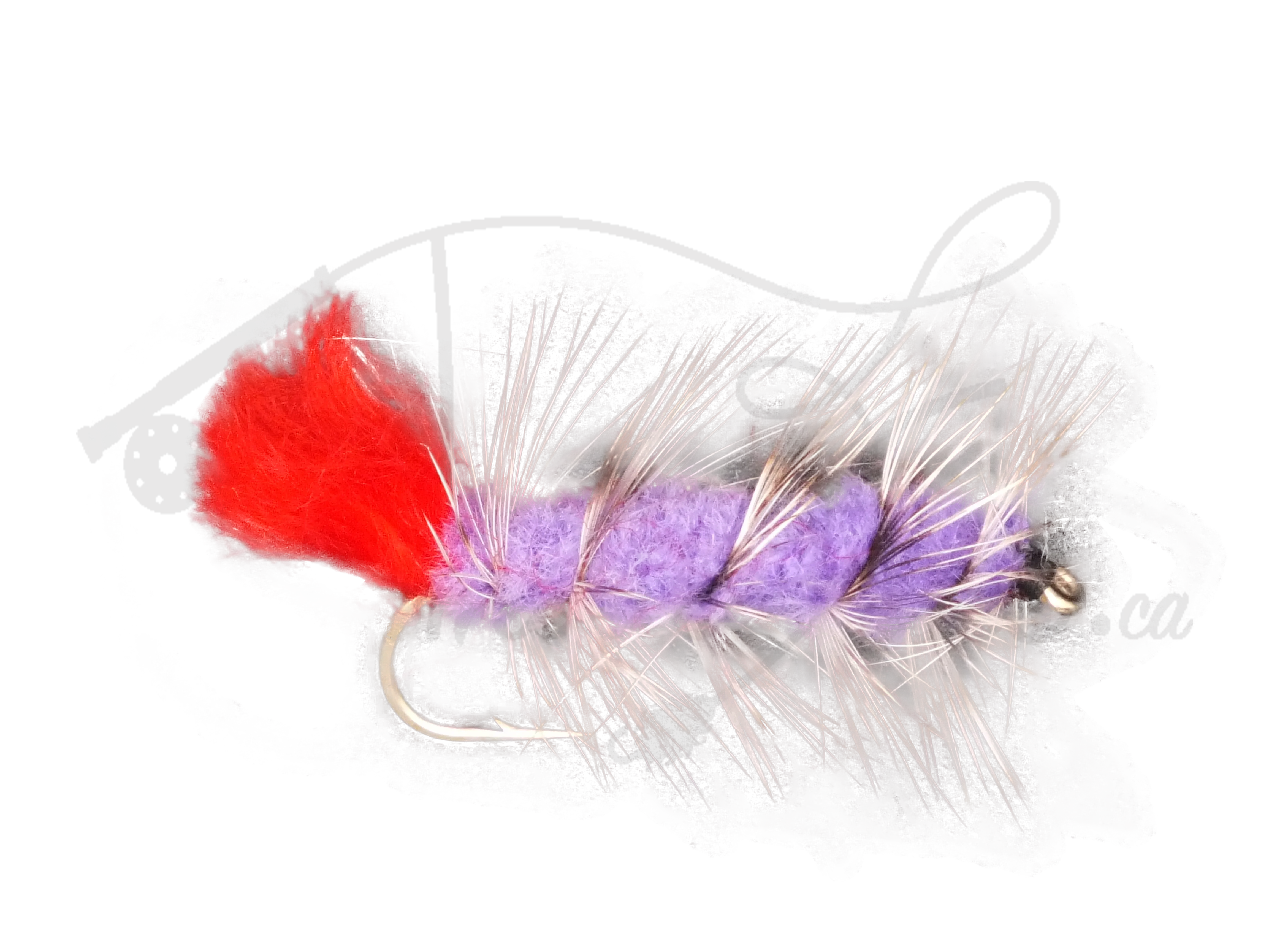 Brown woolly worm fishing fly with red tail and black hackle on white background