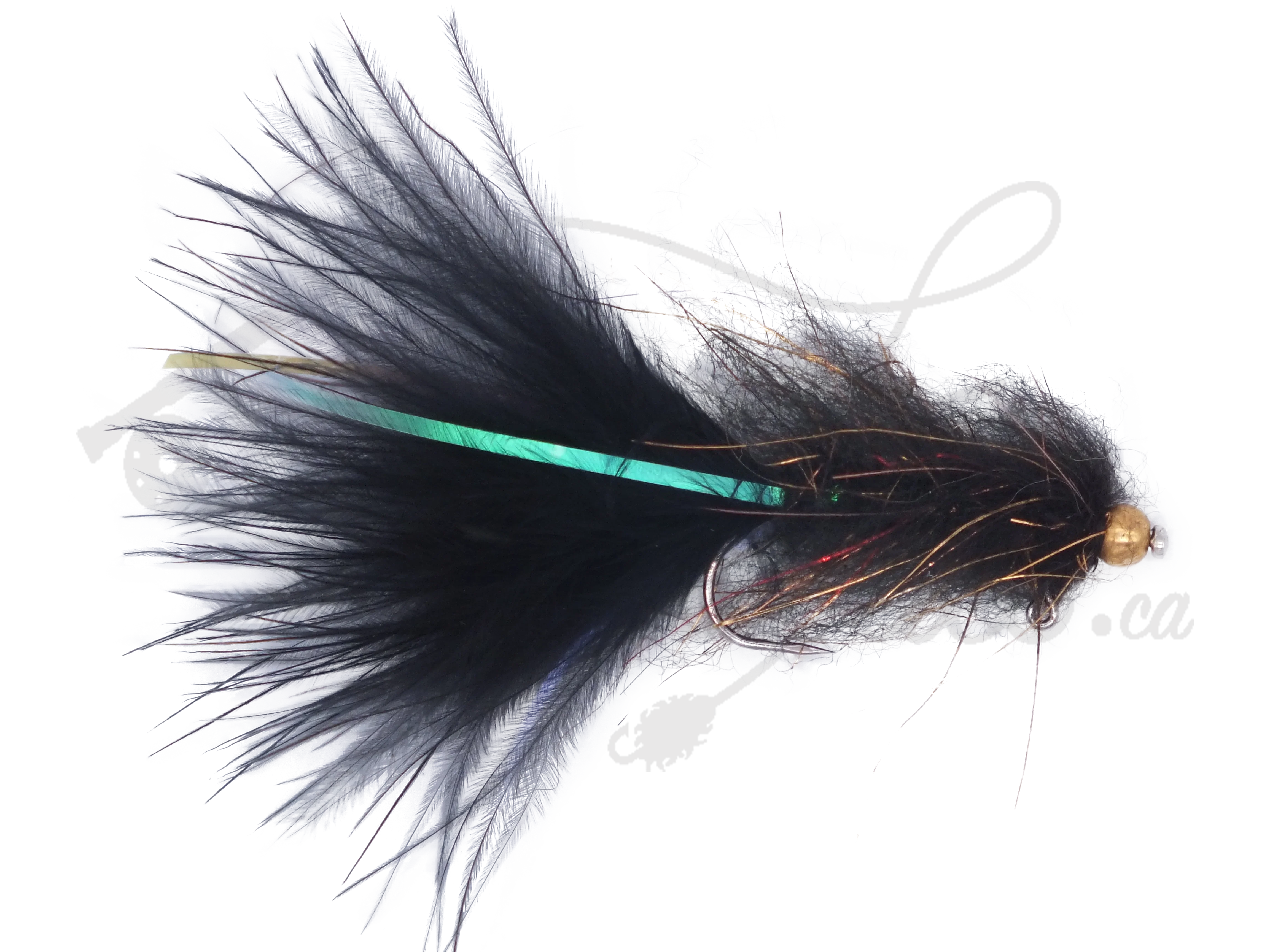 Black beadhead woolly bugger fly fishing lure with gold bead and feather tail