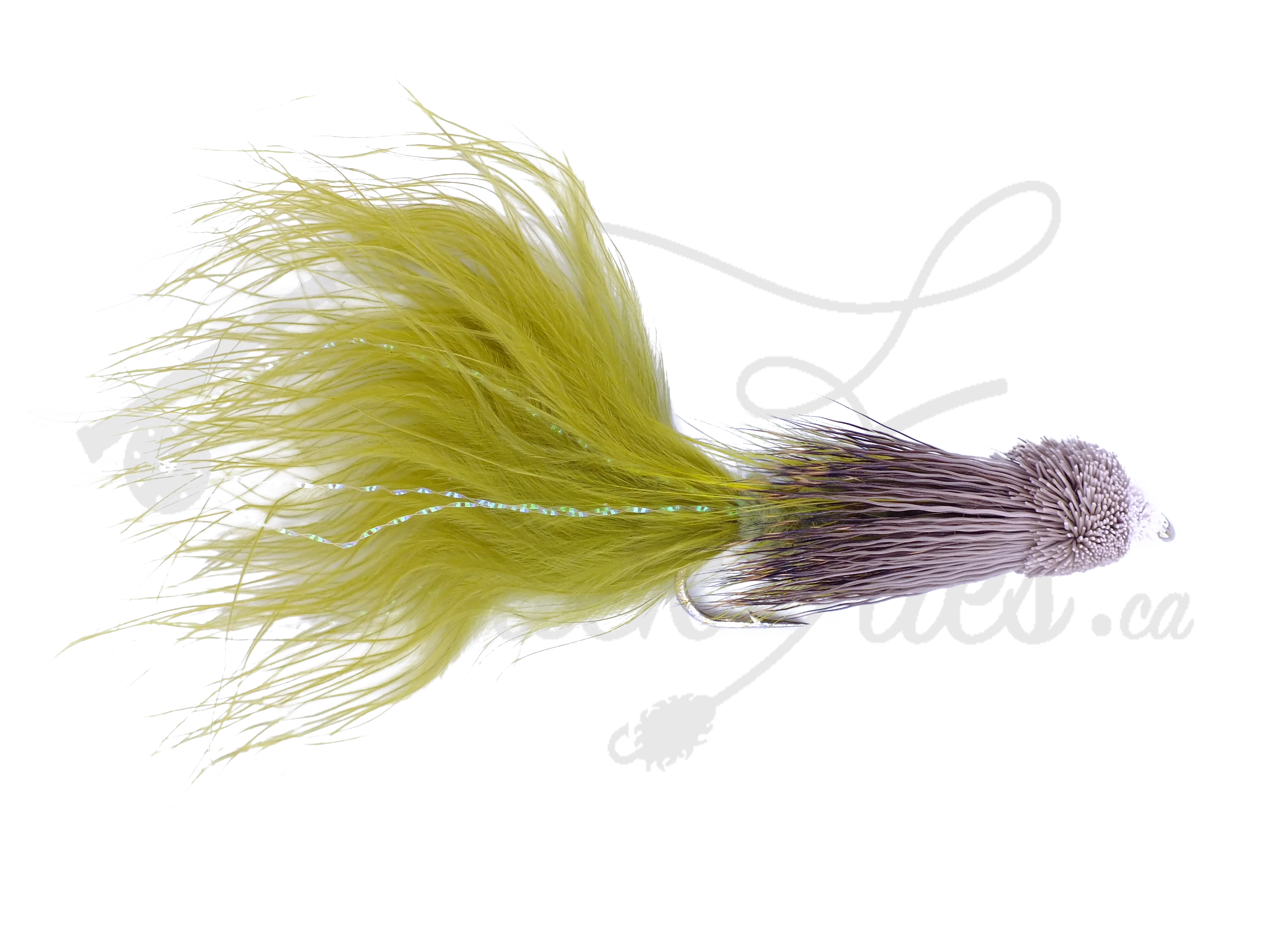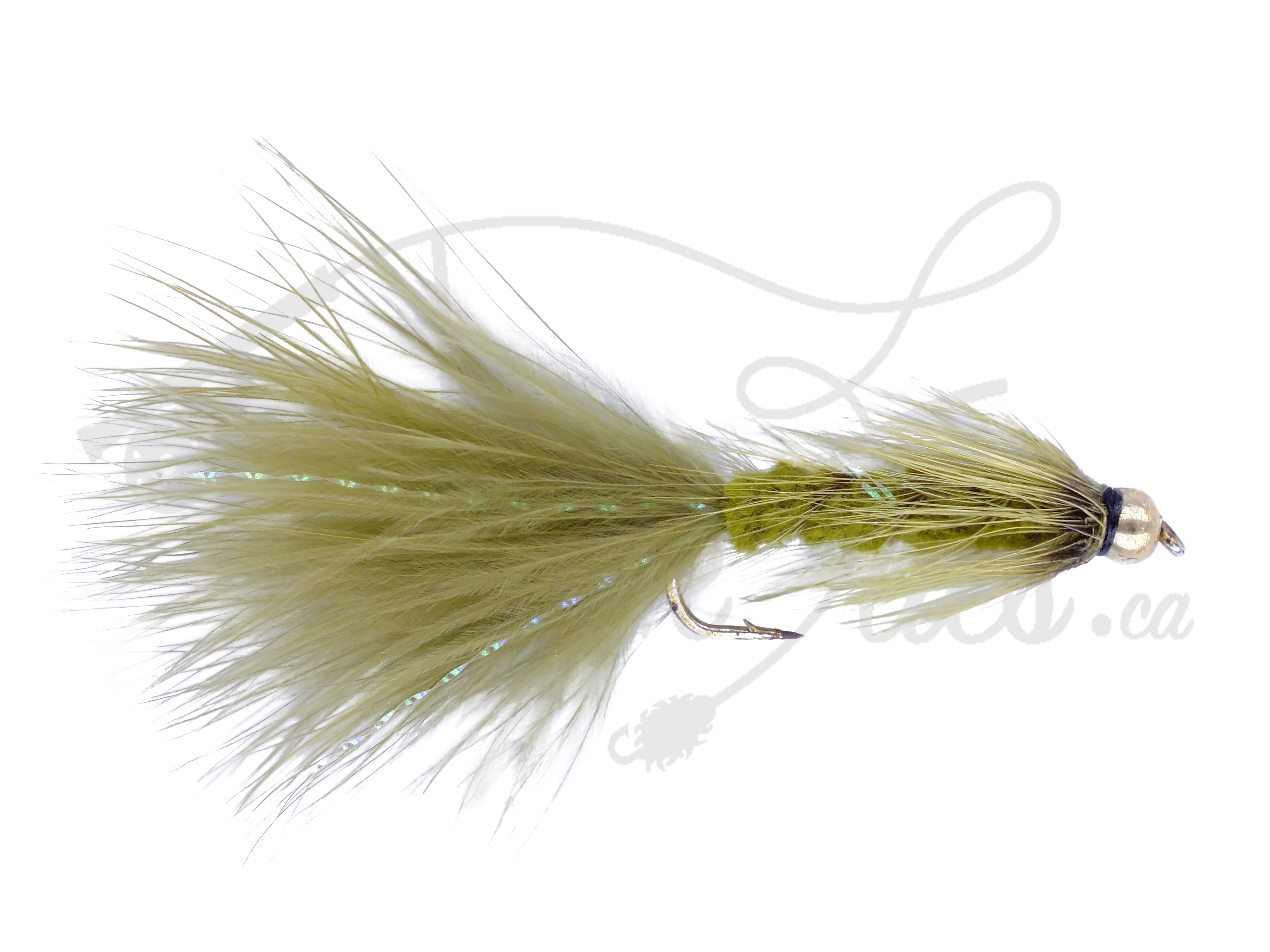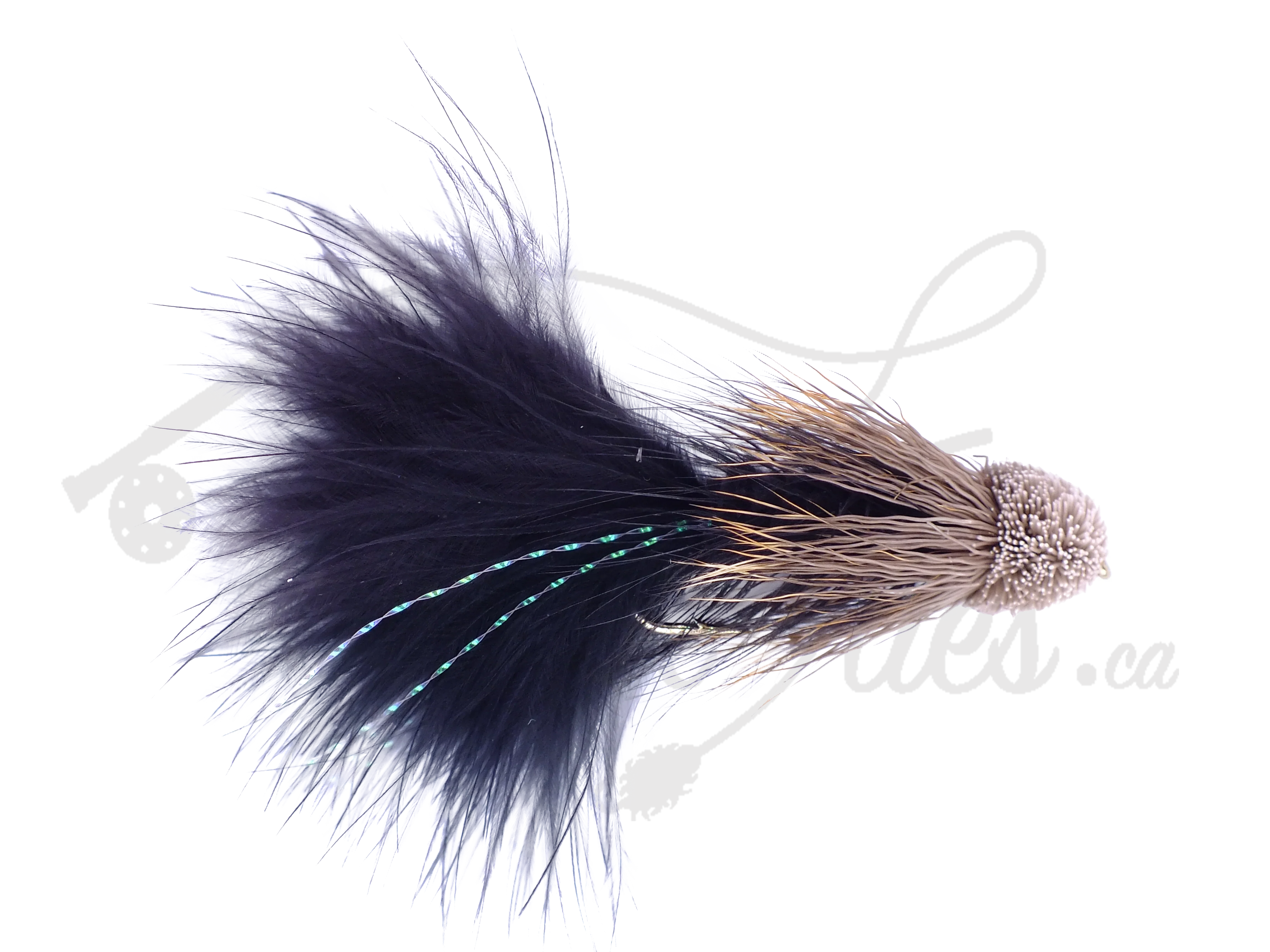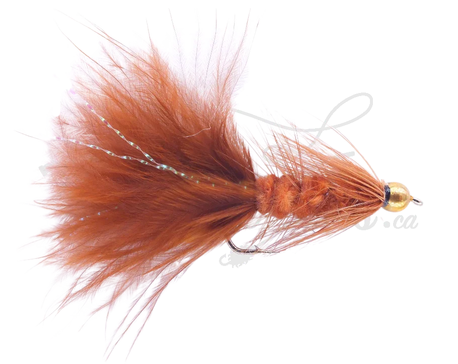 Brown Bow River Bugger fly fishing lure with bushy tail and sculpted head on white background