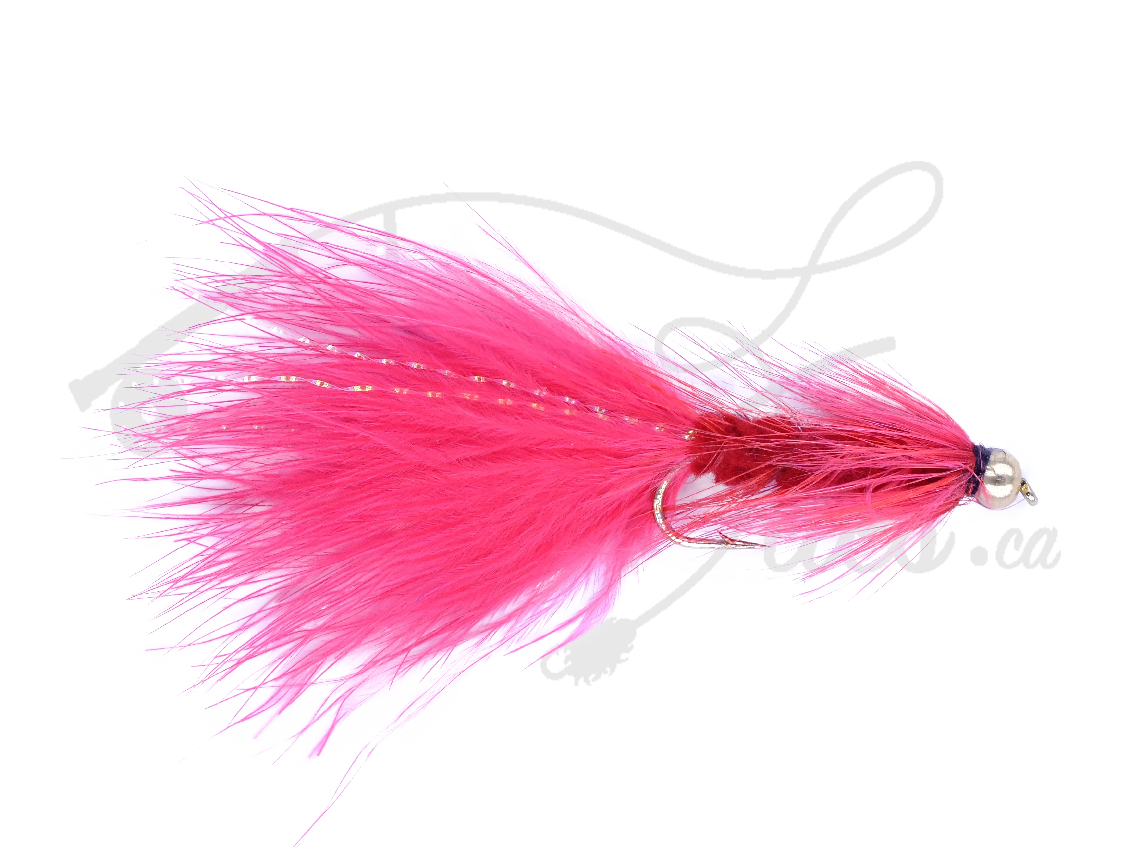Pink beadhead squirmy worm fly fishing lure with gold bead on hook