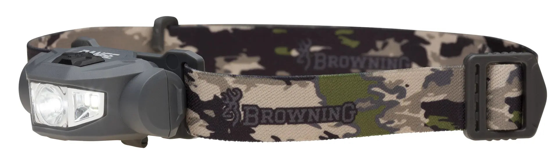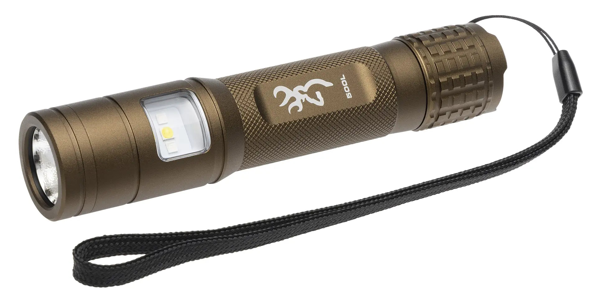 Two people on a forest trail at dusk, one holding a flashlight, the other wearing a headlamp
