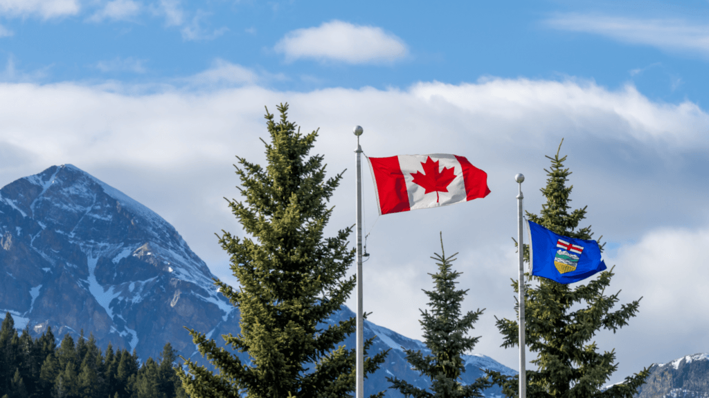 Canadian and Alberta flags flying with pine trees and mountains in the background