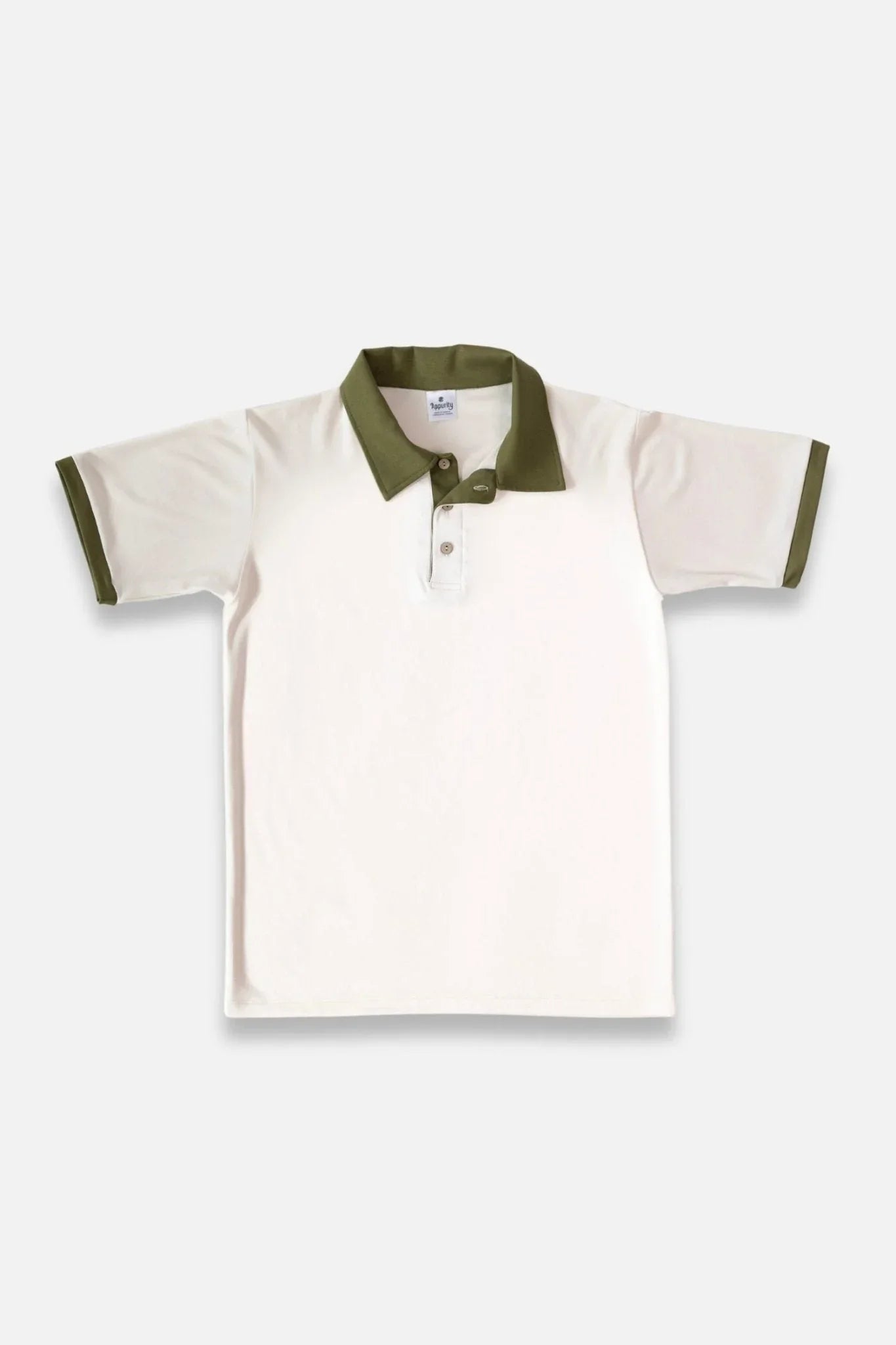 White golf polo shirt on mannequin with logo, isolated on abstract white background