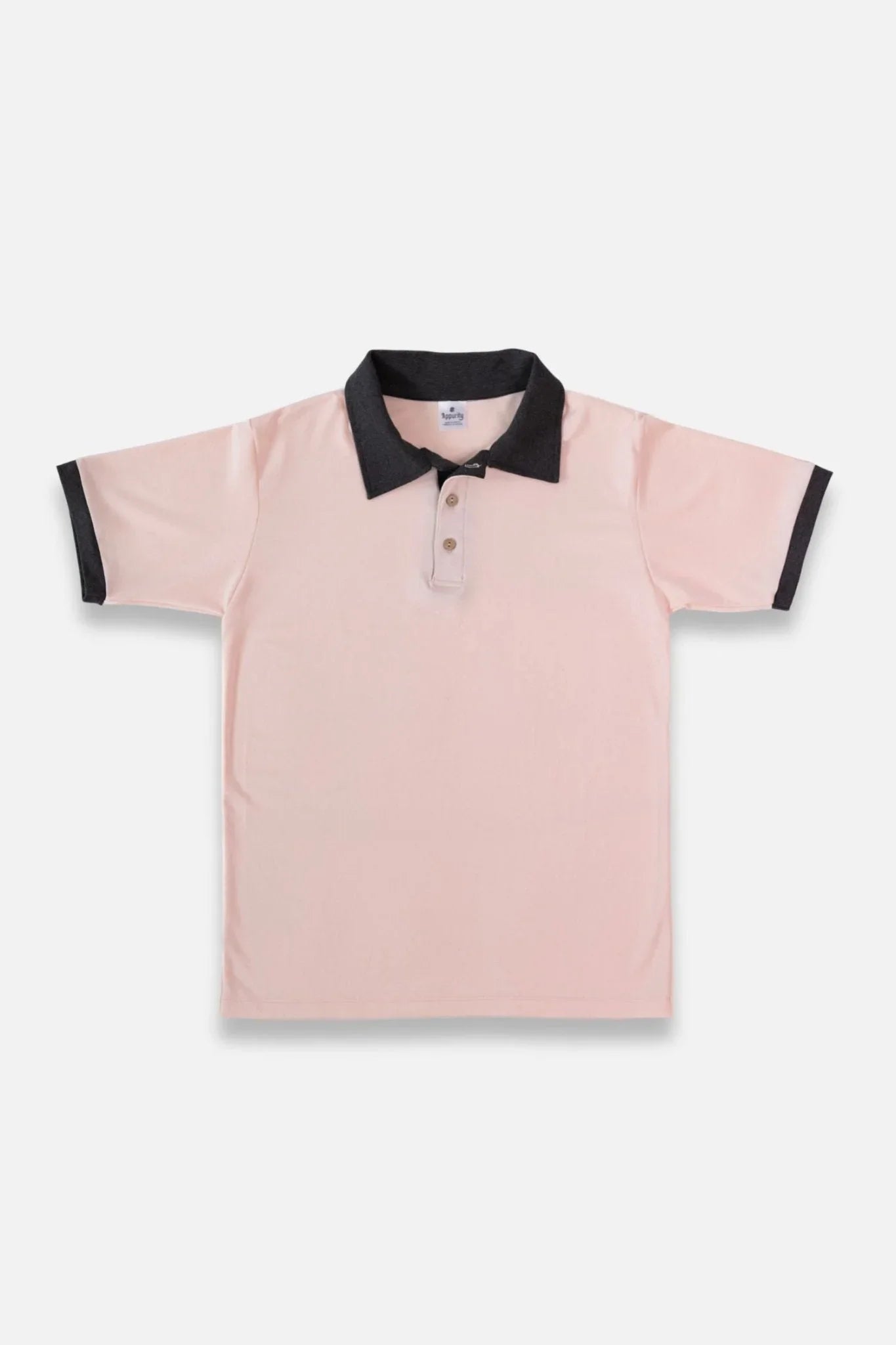 Light pink short sleeve polo shirt on mannequin with subtle stripe pattern