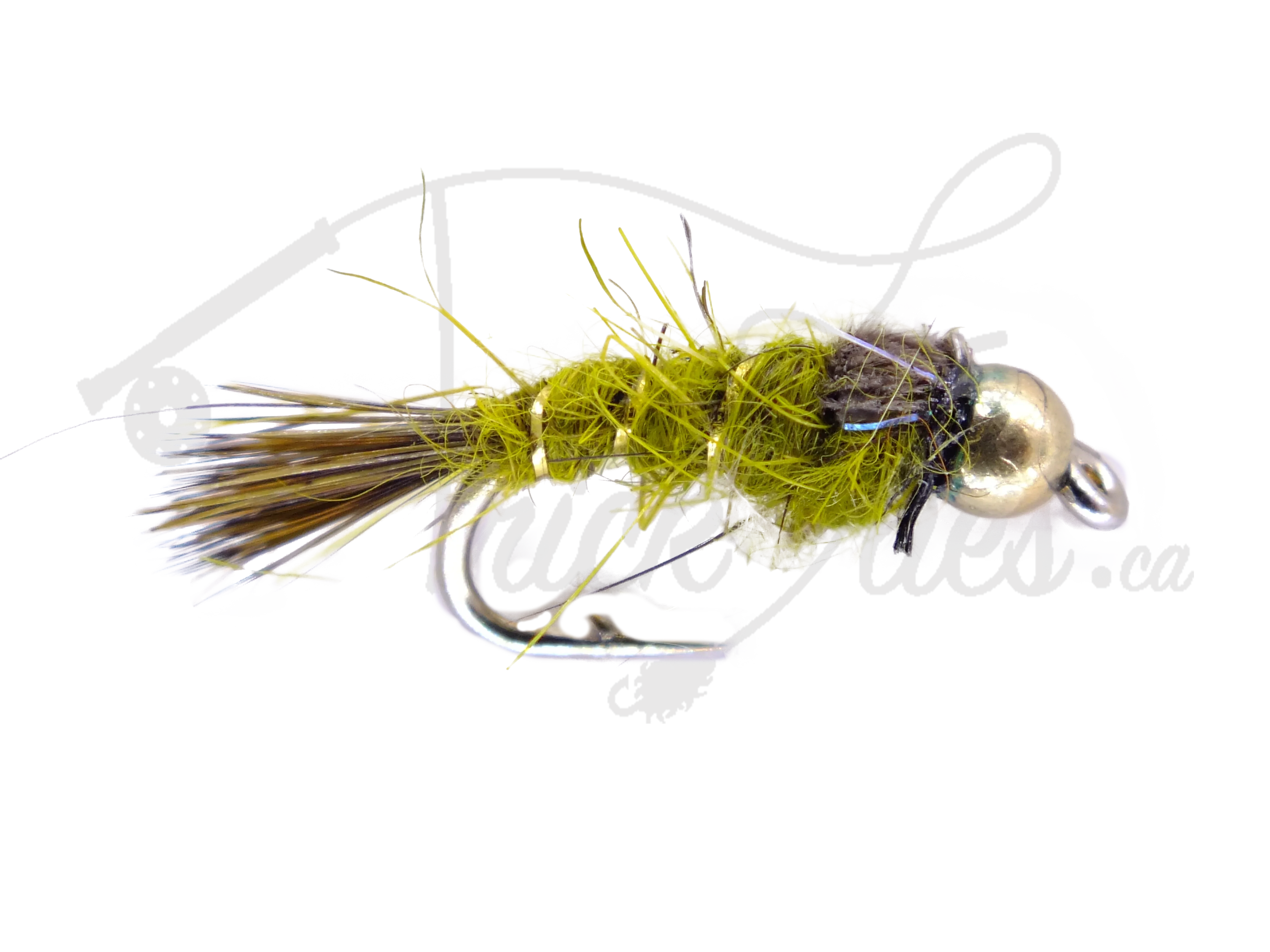 52 Buick fly fishing lure with yellow and black body, feather tail, and silver hook