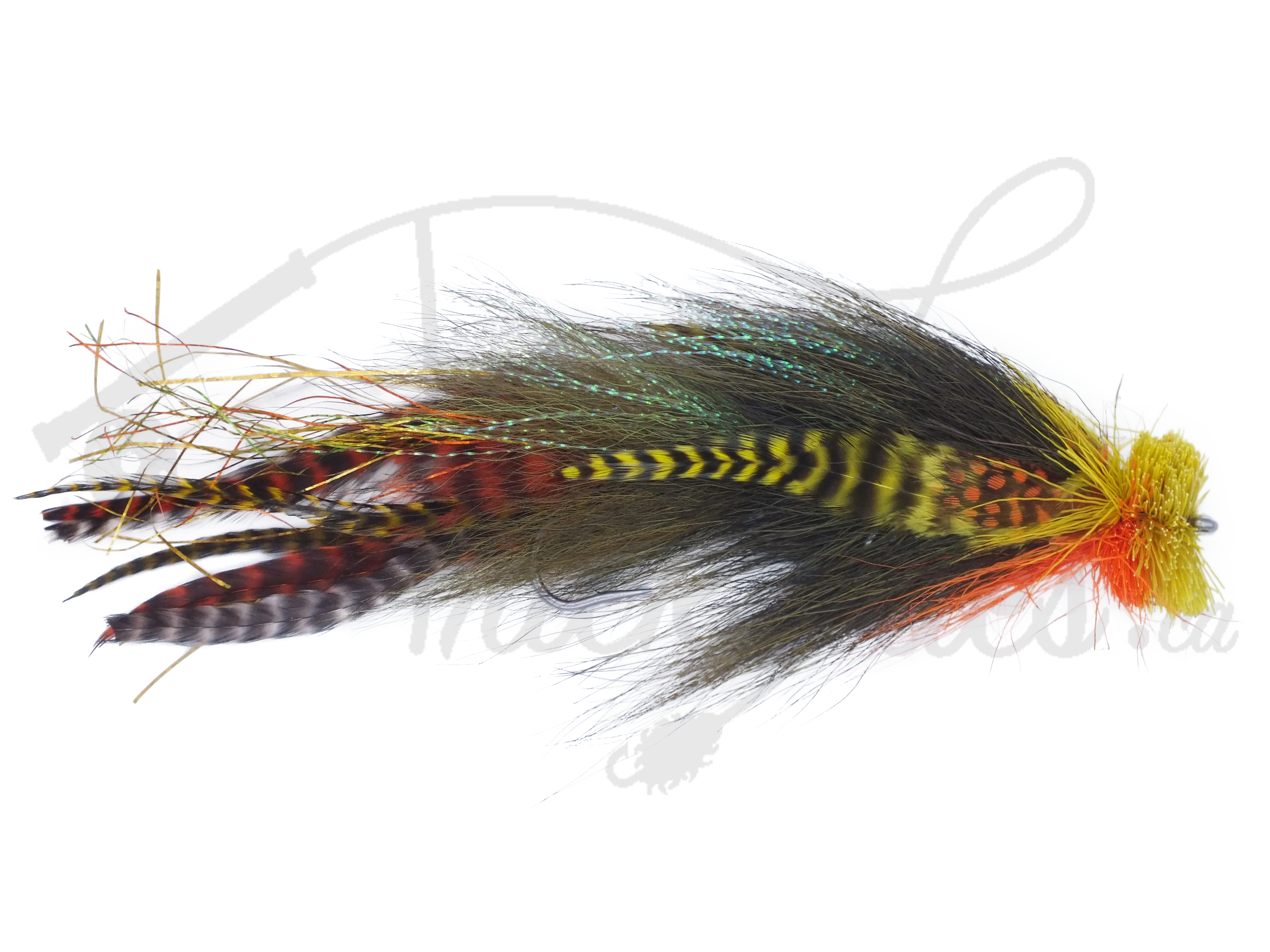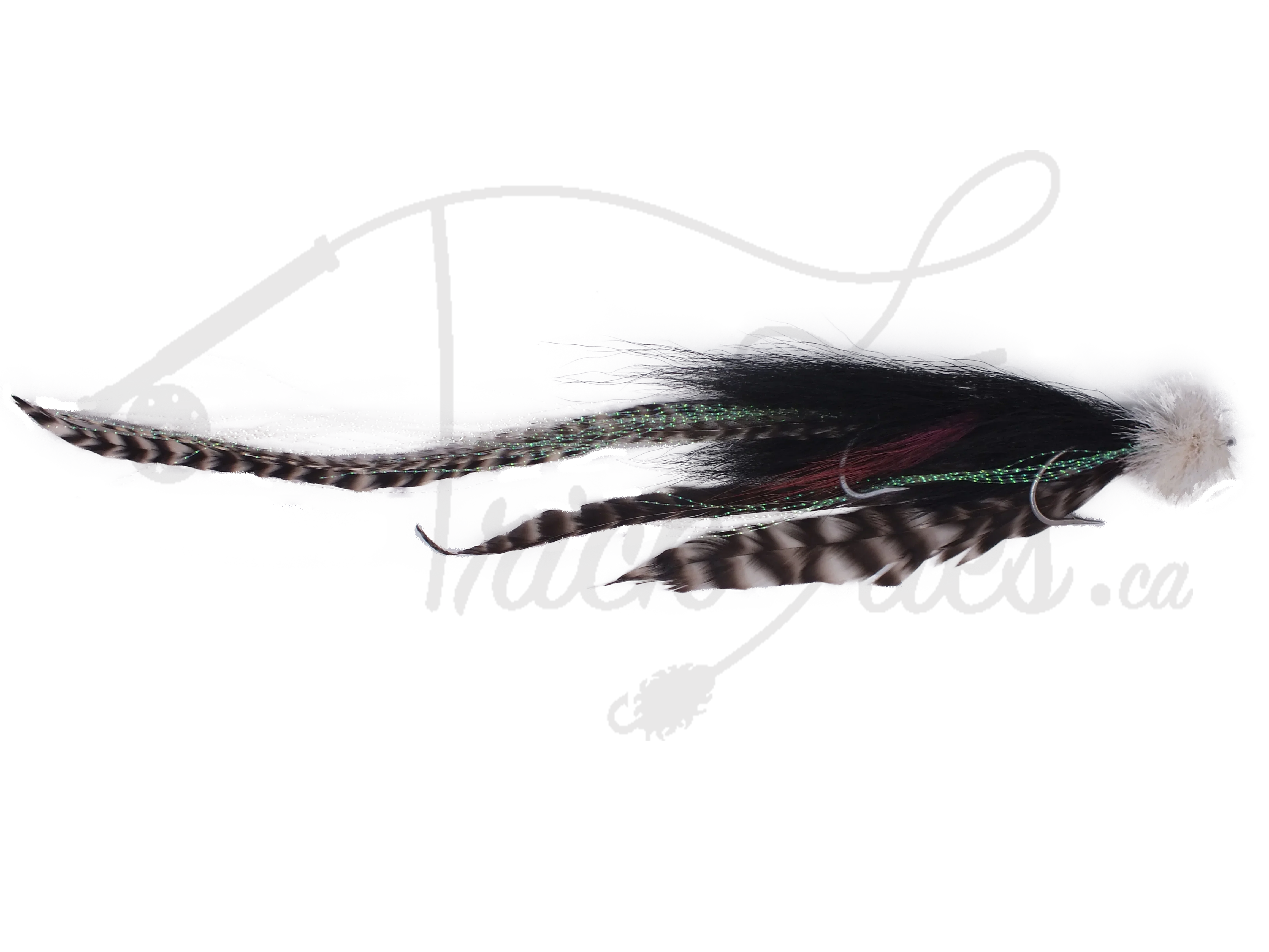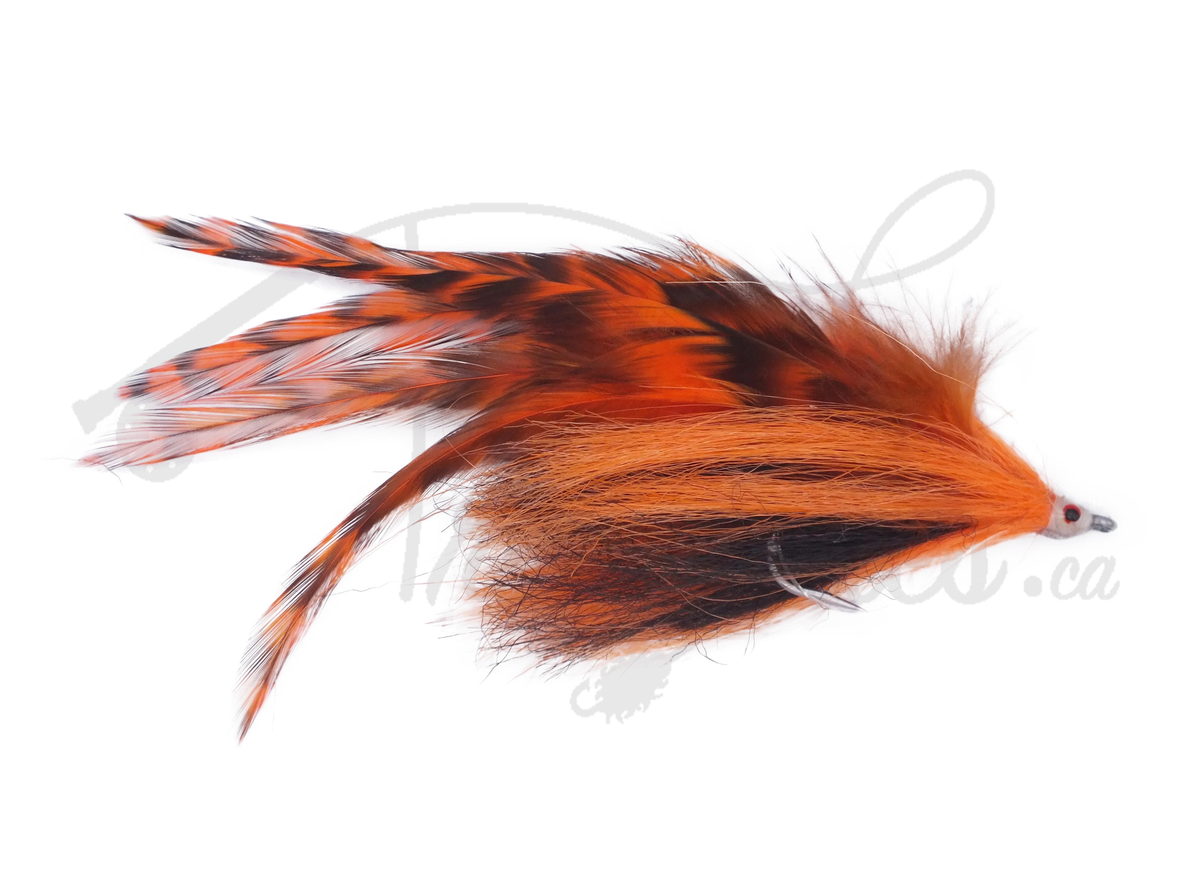 Buford black and orange fly fishing streamer with barred feathers and fur on white background