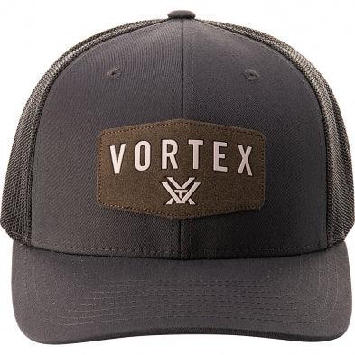 Black Vortex trucker hat with mesh back and brown logo patch on the front