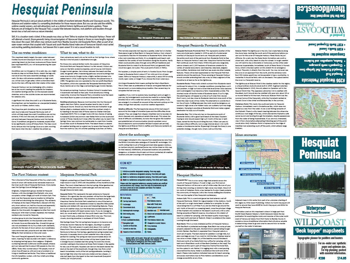 The mapsheet layout: The layout is a regional overview on the full page of one side, and on the other side travel planning details such as expected water conditions, what to see and do, the First Nations context, and tons of background information on the various attractions including the Hesquiat Trail.