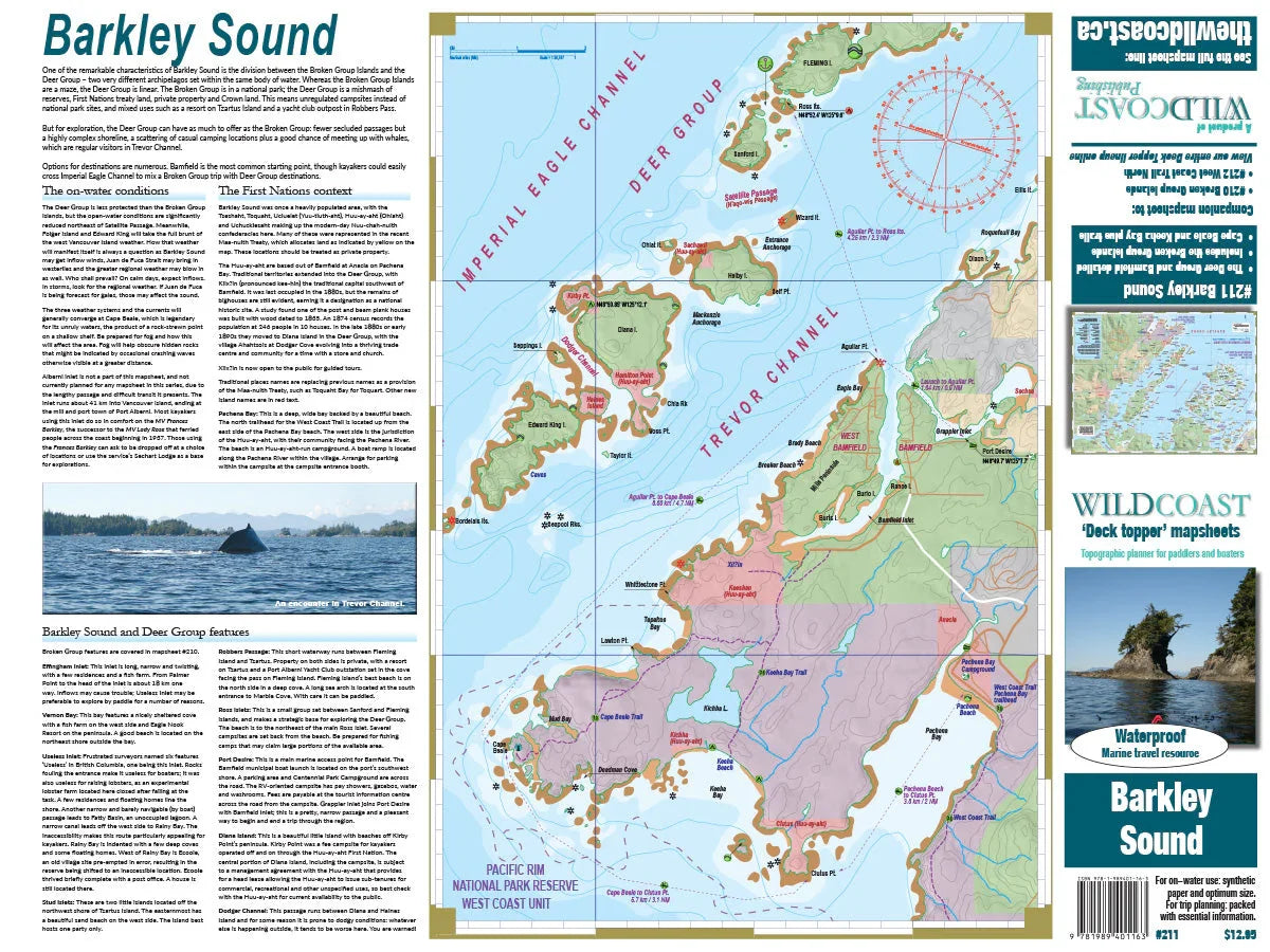 About the Wild Coast map series: In 2019, Wild Coast Publishing began embarking on an ambitious program to provide an unbroken series of mapsheets covering the entire BC coastline. The series begins with mapsheet #201 Brooks Peninsula and extends in order down the outer Vancouver Island and up the southern BC coast then finally north through the Inside Passage. You can view the currently available list of mapsheets here. The maps are designed for paddlers and boaters, right down to the size -- a handy 24x18", slightly smaller than a traditional street map and so easy to manage when on the water. Use it as a "deck topper" for easy visualization as you travel on the water, use it around the campfire or your anchorage at night to plan your next day's route, and at home for research when your journey is still in the dream stage.