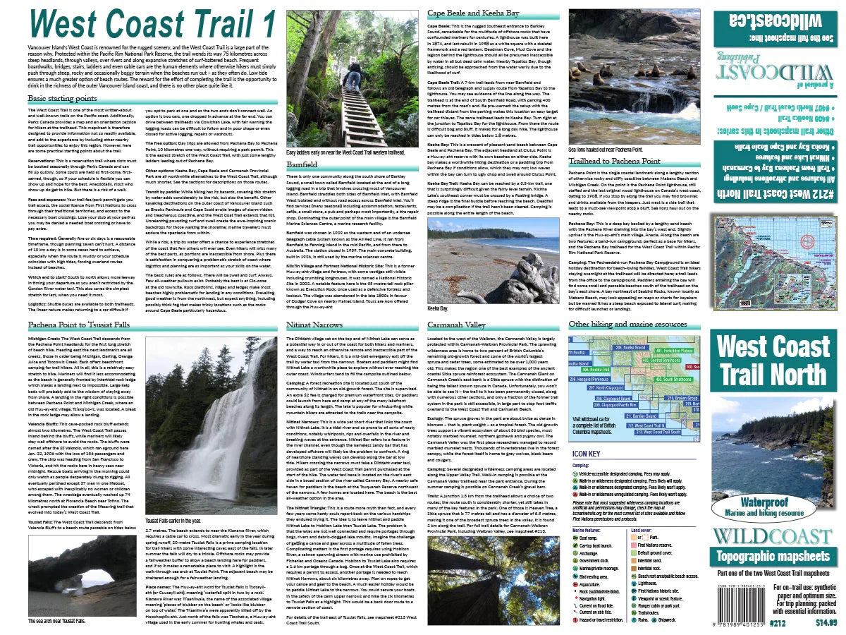 About this mapsheet: This mapsheet covers the West Coast Trail as a hiking resource, and expands the coastal route into a regional overview including Nitinat Lake and Carmanah Valley, for those who want to turn a trail hike into a larger exploration of the region. But it is also a marine mapsheet to facilitate a coastal transit as part of the Wild Coast marine mapsheet series that when complete will provide an unbroken overview of the entire British Columbia coastline. As such it is part of the hybrid Wild Coast marine and trail mapsheet series. It should be coupled with Mapsheet #213 West Coast Trail South to complete the trail in its entirety.