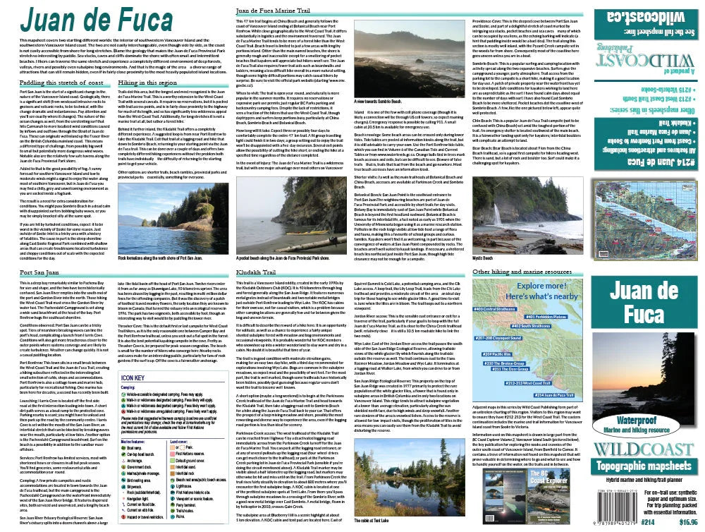 About this mapsheet: This mapsheet covers the southwestern Vancouver Island coast and all the marine features from Port Renfrew to Sooke. It also includes the inland information including details on the Juan de Fuca Marine Trail and the Kludakh Trail.