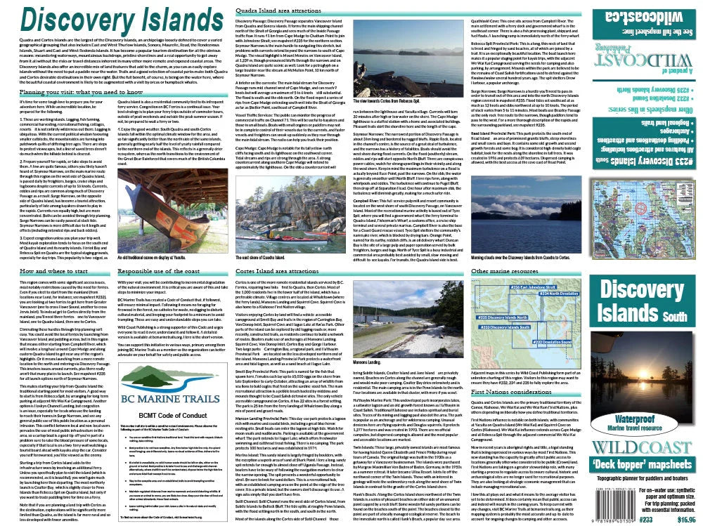 #233 Discovery Islands South: This mapsheet is for anyone starting their adventure on or near Quadra Island, and so is ideal for anyone planning a trip into the area starting from a Vancouver Island launch location. It includes Discovery Passage and Seymour Narrows, Heriot Bay and Rebecca Spit, and Hoskyn Channel up to Surge Narrows. It also includes all of Cortes Island for those planning a stay there or a circumnavigation. Use it for land attractions and hiking trails as well on both Quadra Island and Cortes.