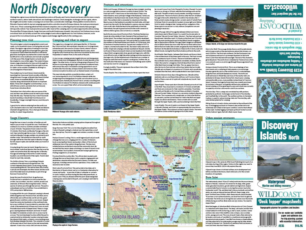 #235 Discovery Islands North: This mapsheet covers the Discovery Island region from Surge Narrows north, so includes all of Sonora Island and the surrounding attractions such as the Octopus Islands, but also all of Okisollo Channel and the wider waterways including Nodales Channel and Yaculta Rapids. Because of the type of environment, much of the textual information is dedicated to assisting with navigating the currents.
