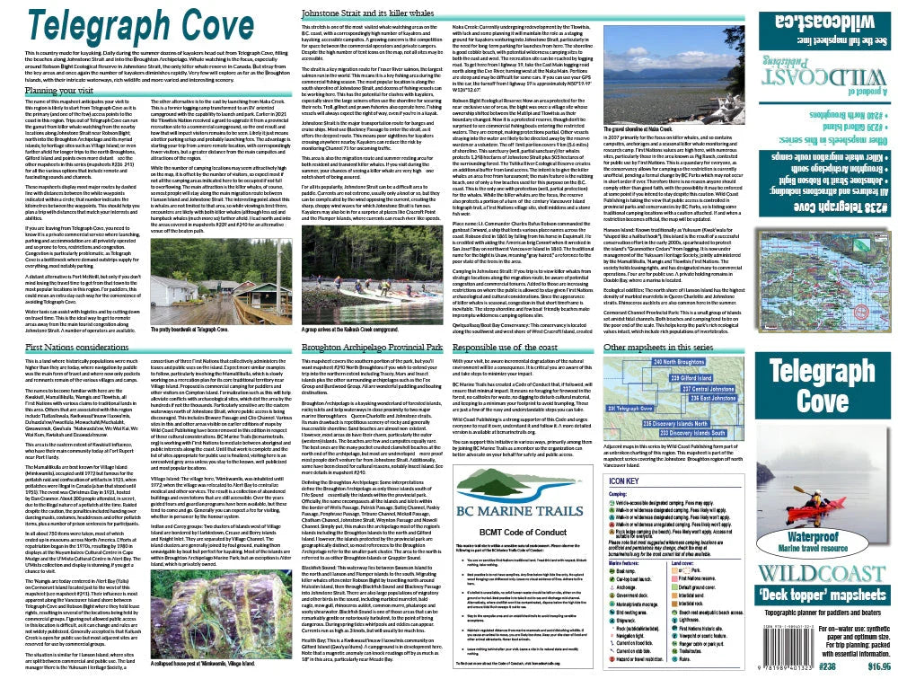 About this region: This mapsheet is intended for anyone departing from Telegraph Cove or Naka Creek into Johnstone Strait or the Broughton Archipelago. The attractions are killer whale watching near Robson Bight and heading into the picture-perfect island clusters of Broughton Archipelago Provincial Park. This mapsheet is newly updated for 2023 reflecting the latest in cultural sensitivities and other vital travel information.