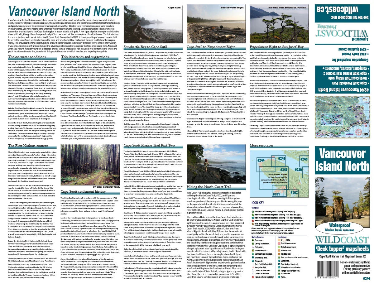For the Cape Scott Marine Trail: A formal kayaking/paddling route exists that runs from Port Hardy to Coal Harbour around north Vancouver Island. It is an exceptional opportunity for expert paddlers. To use the Wild Coast Publishing mapsheets to complete this epic voyage, use mapsheets #243-245. The three mapsheets can be purchased as a bundle.