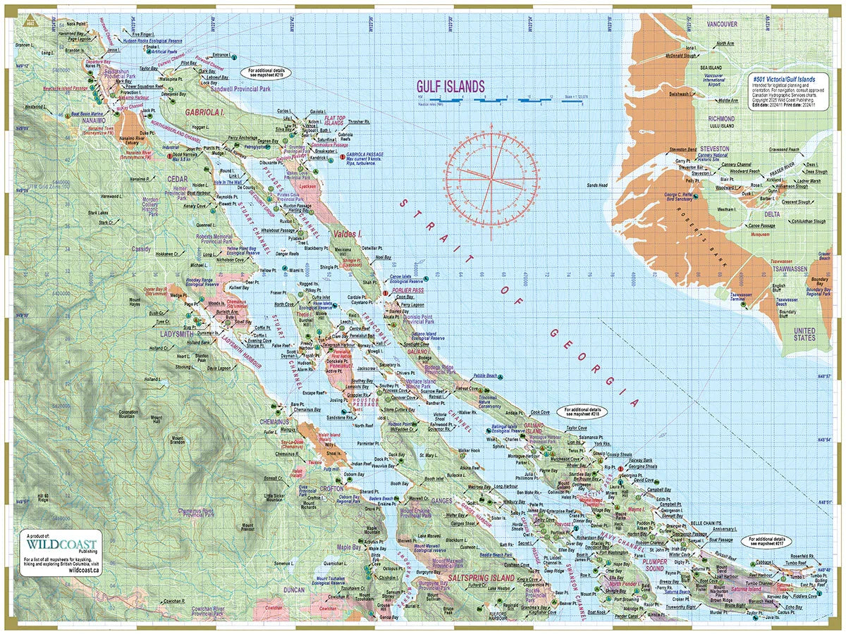 Area covered: This mapsheet includes the entire south coast of Vancouver Island from Sooke to Nanaimo, and all of the Gulf Islands to the BC Mainland including Richmond, Delta, Steveston and the lower Fraser River. Sooke to Victoria is covered on one side and Victoria north to Nanaimo on the opposite side.