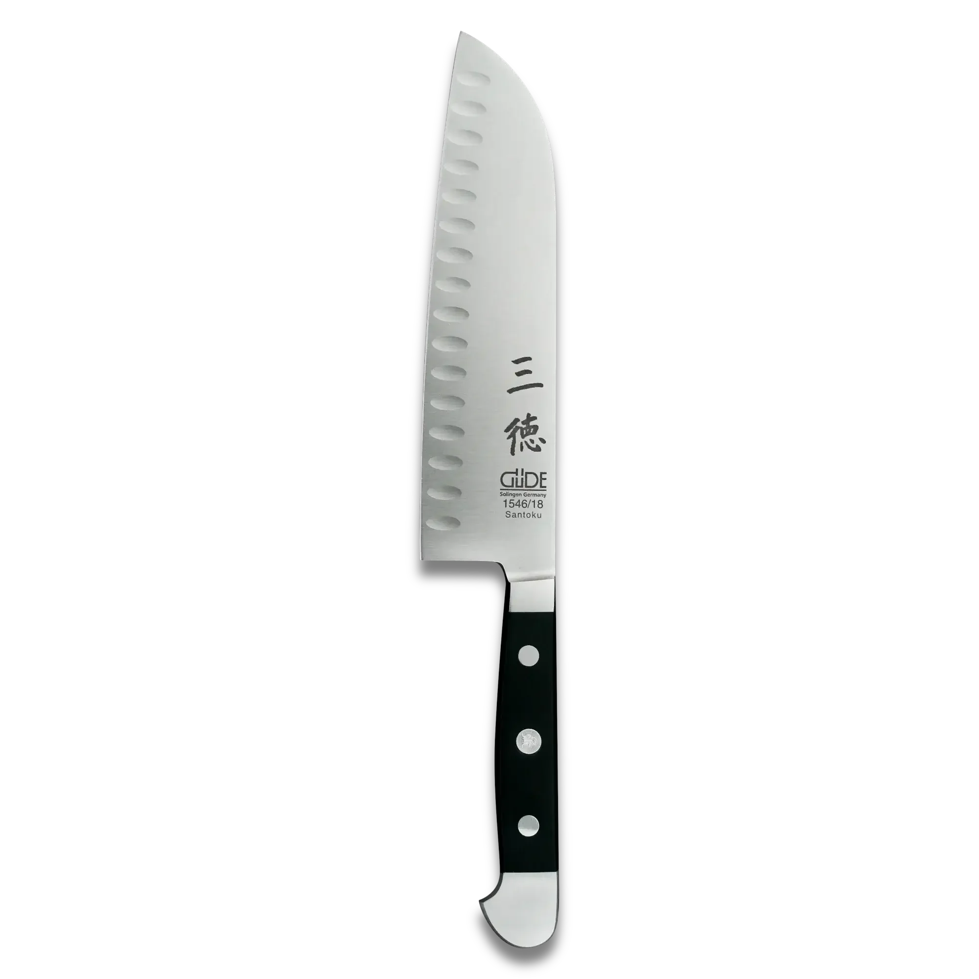 The Alpha Santoku from Gude Solingen is adequate for the European chef's knife. A universal knife that is used in Japanese kitchens for almost all cutting work. In contrast to the European chef knife, it has a wider, straighter blade, which is only slightly rounded at the tip. This is due to the chopping technique preferred in Asia.