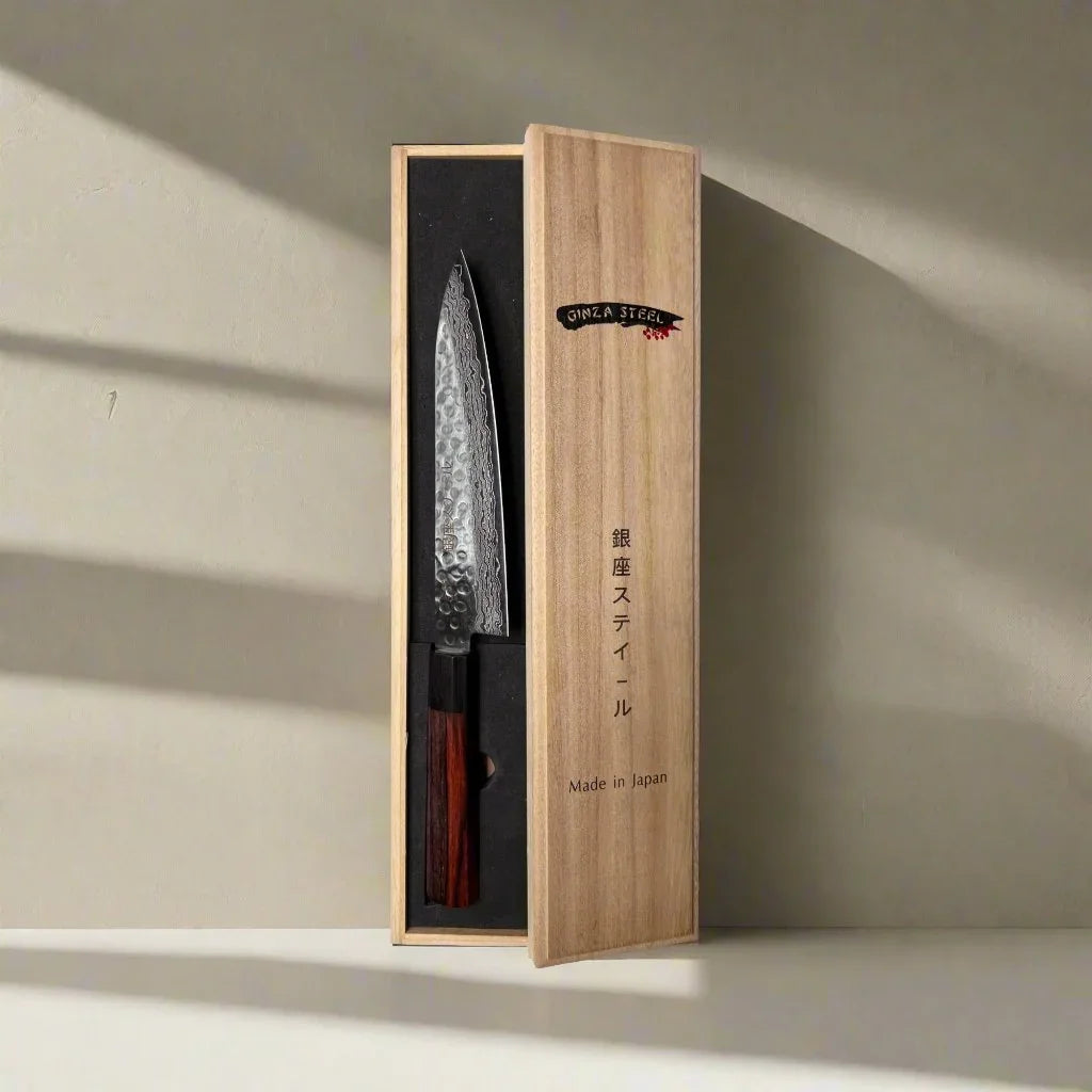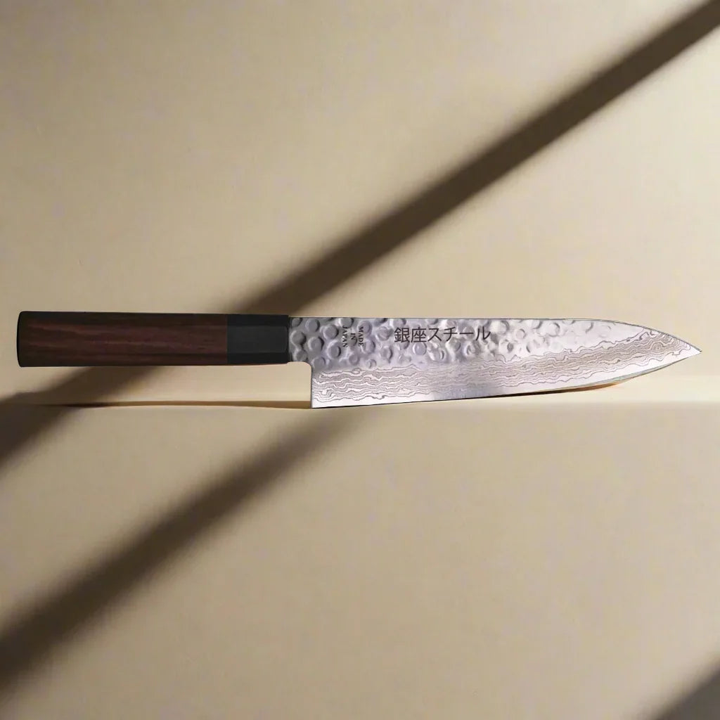 The Amaya 180 by Ginza Steel is a handcrafted Gyuto/Chef Knife with a 180mm blade, made in Seki City, Japan. Crafted from high carbon Swedish steel and featuring a chestnut handle, this versatile knife is perfect for large vegetables and meat.