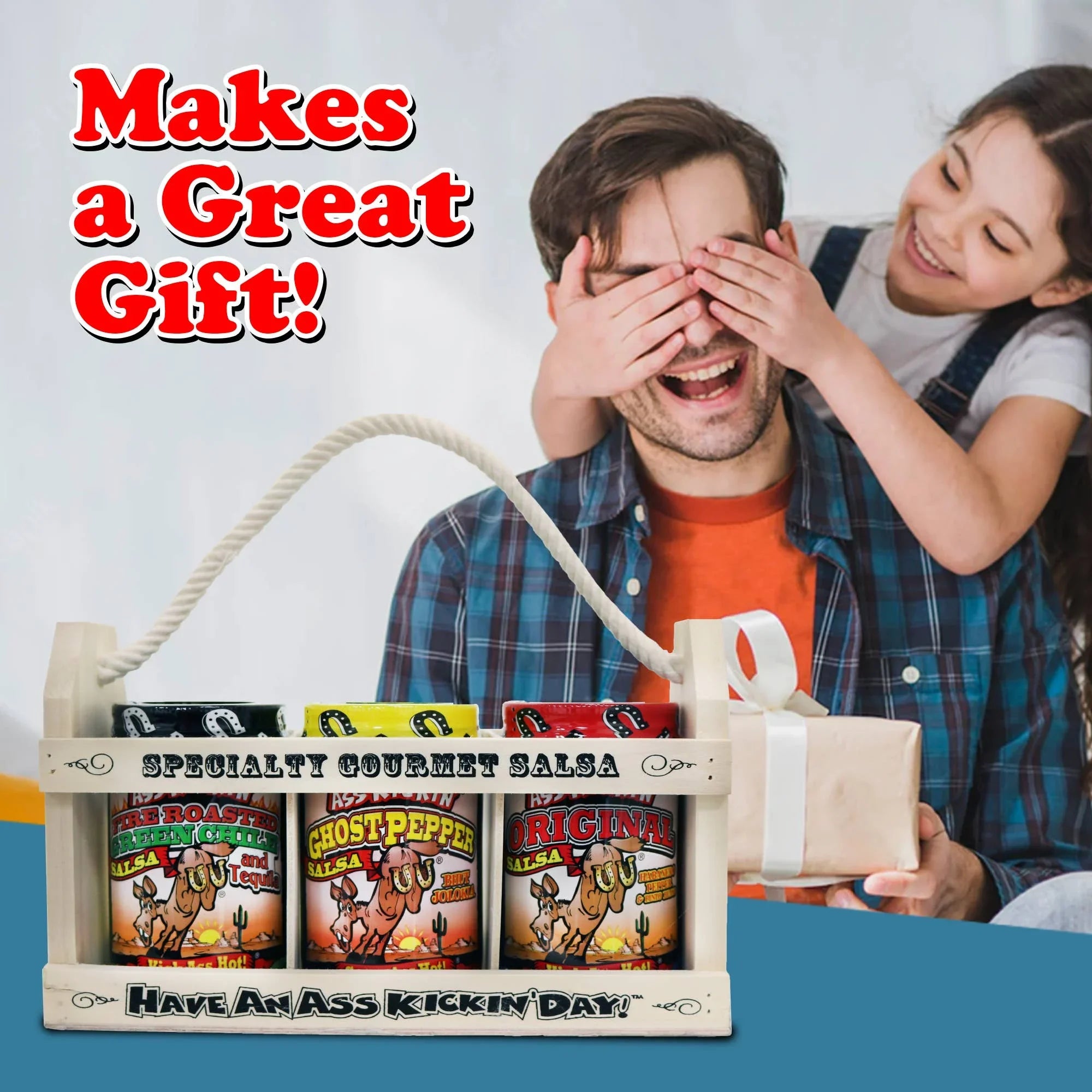 Ass Kickin’ Salsa Wooden Crate Gift Set: Three Jars of 13 oz. (384mL) Ass Kickin’ Salsa.• Ass Kickin’ Original Salsa• Ass Kickin’ Margarita Salsa (Mild)• Ass Kickin’ Roasted Garlic Salsa