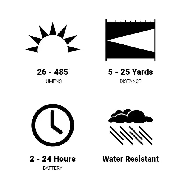 | Bulb ColorRed:White | Brightness LevelsHigh:Low:Medium:Strobe |