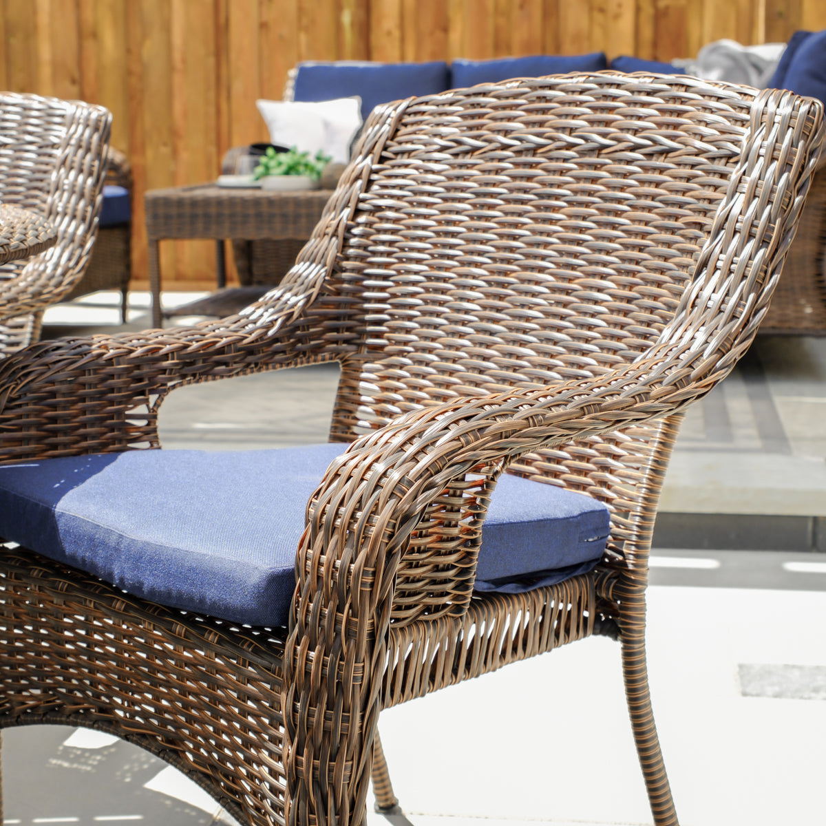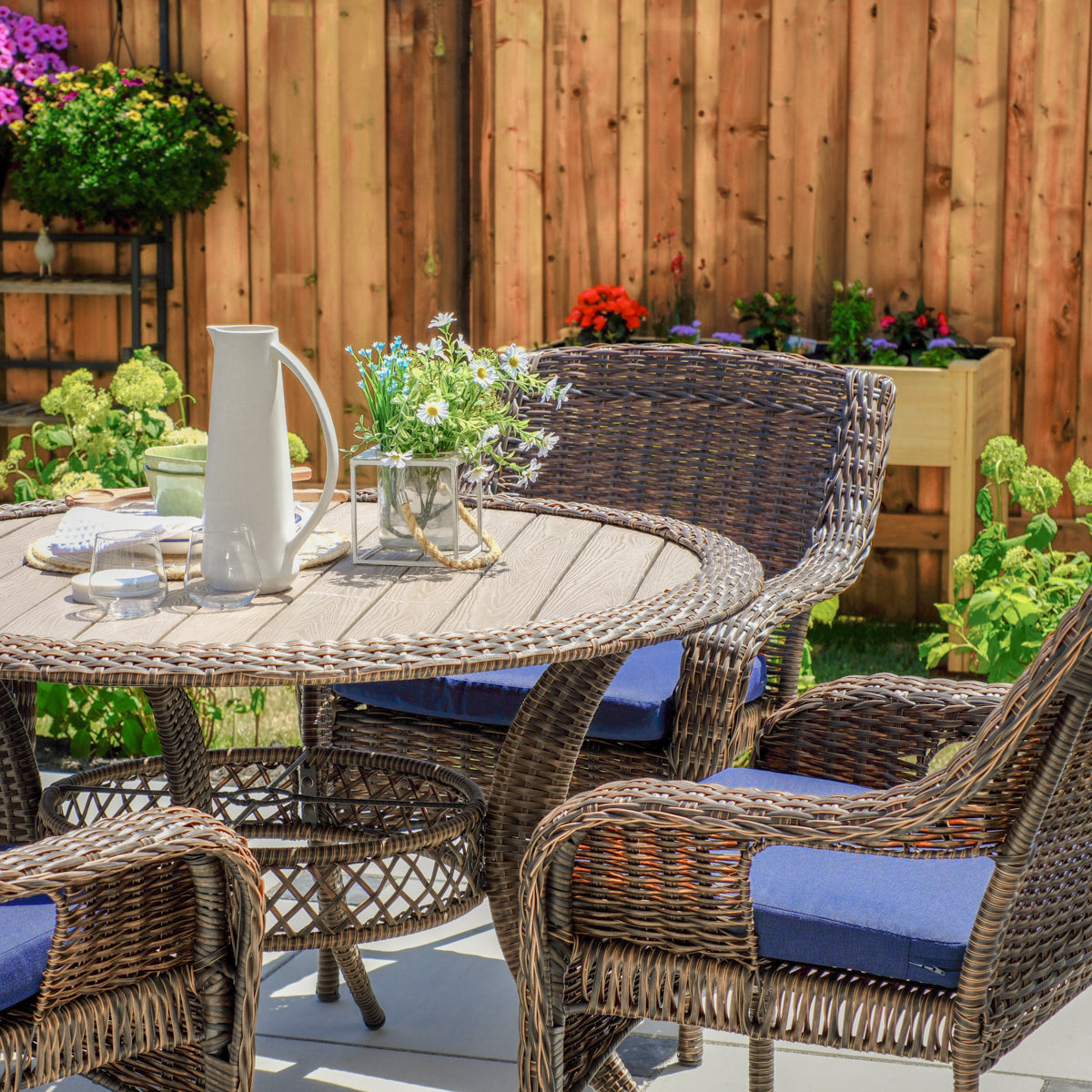 The Cambridge 5-Piece Dining Set is a hosting essential for your yard. Featuring four armed dining chairs and a finely woven round dining table. Add to that a built-in umbrella holster for sunny days and slatted tabletop to prevent water retention, dinner in the fresh air has never been easier.