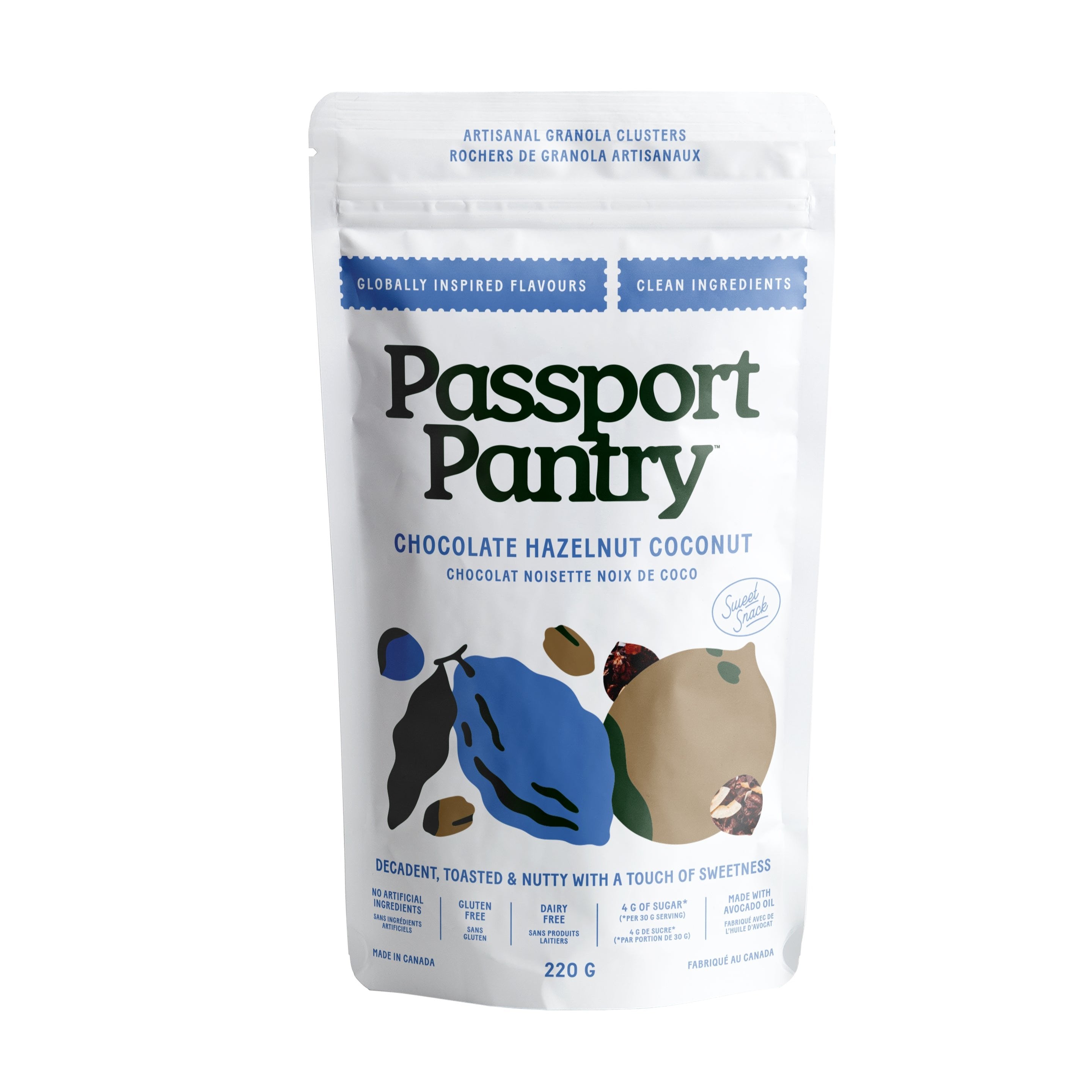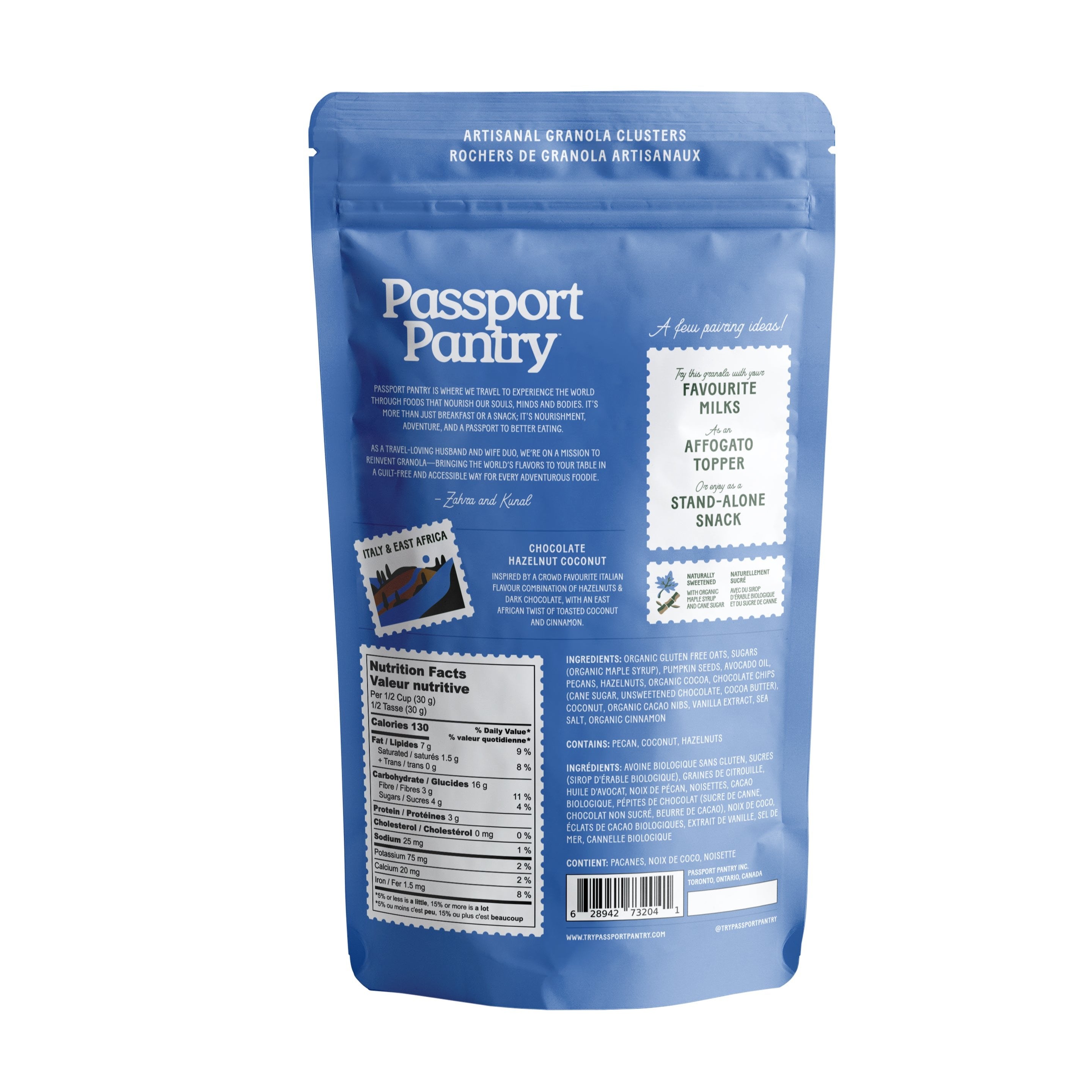 INGREDIENTS: Organic gluten free oats, Sugars (organic maple syrup), Pumpkin seeds, Avocado oil, Pecans, Hazelnuts, Organic cocoa, Chocolate chips (cane sugar, unsweetened chocolate, cocoa butter), Coconut, Organic cacao nibs, Vanilla extract, Sea salt, Organic cinnamon