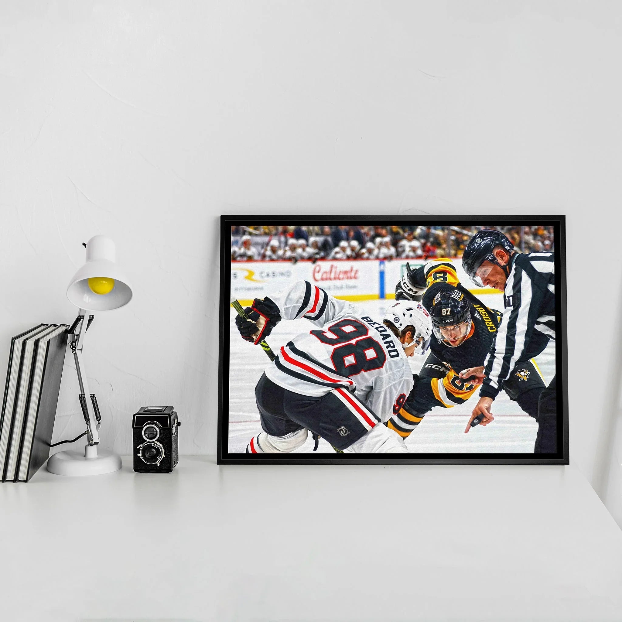 Frozen in the split second before the puck drops, this framed canvas captures Connor Bedard locked in a head-to-head moment against a generational opponent—every muscle, stripe and helmet reflection rendered with museum-level clarity.