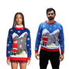 If you feel like you’re done playing it safe at Christmas parties, this is the sweater choice for you! It’s got a great colorful design, a snowman and snowflakes which are essential for that festive feel and Santa! Just not in the traditional way we’re used to seeing him. It’s Santa 2.0. Santa caught in the act, ‘cause hey, a man’s gotta go when a man’s gotta go.