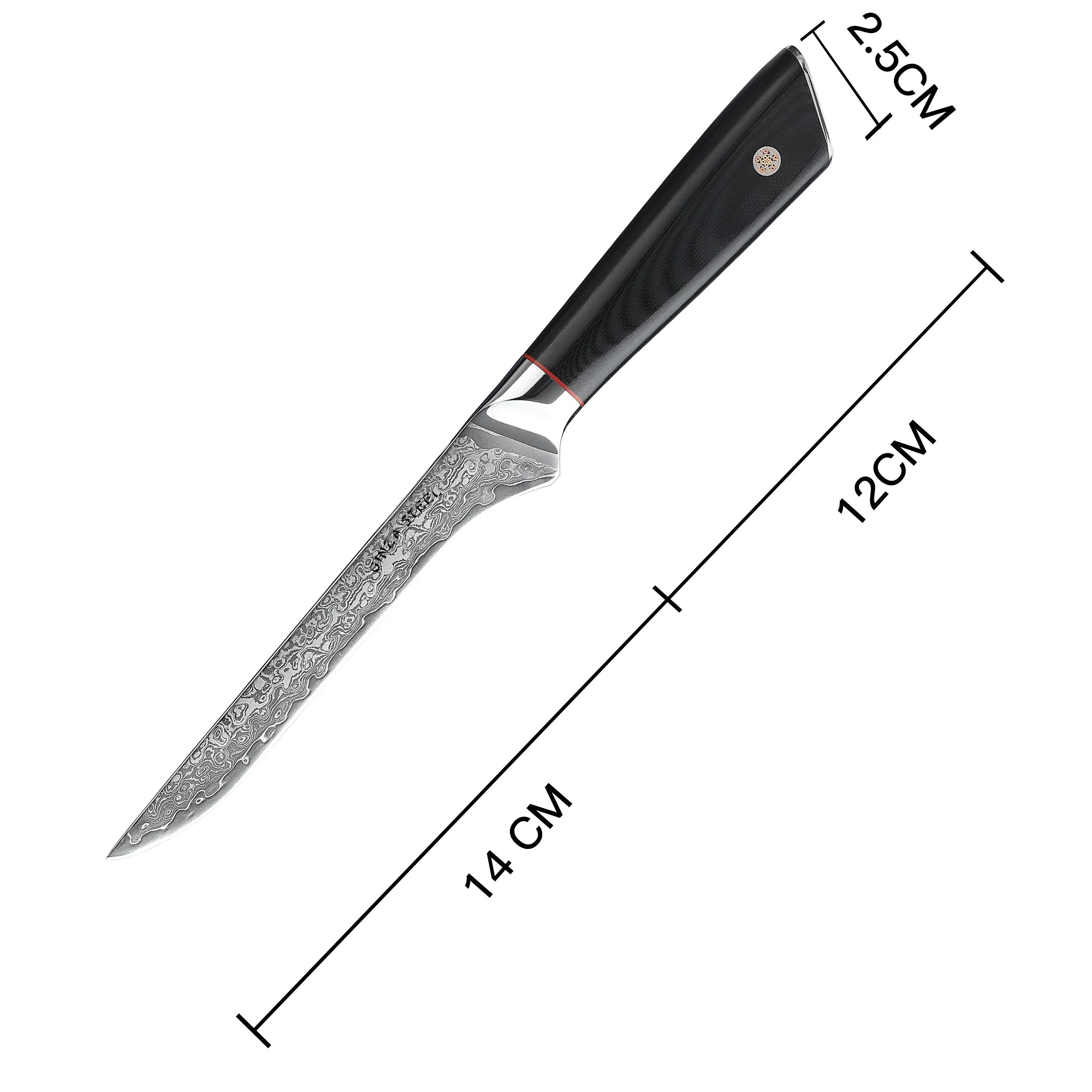 A 5.5-inch marvel crafted with a AUS 10 Steel Core for unparalleled sharpness and durability. The G-10 handle ensures a comfortable grip for efficient boning tasks.