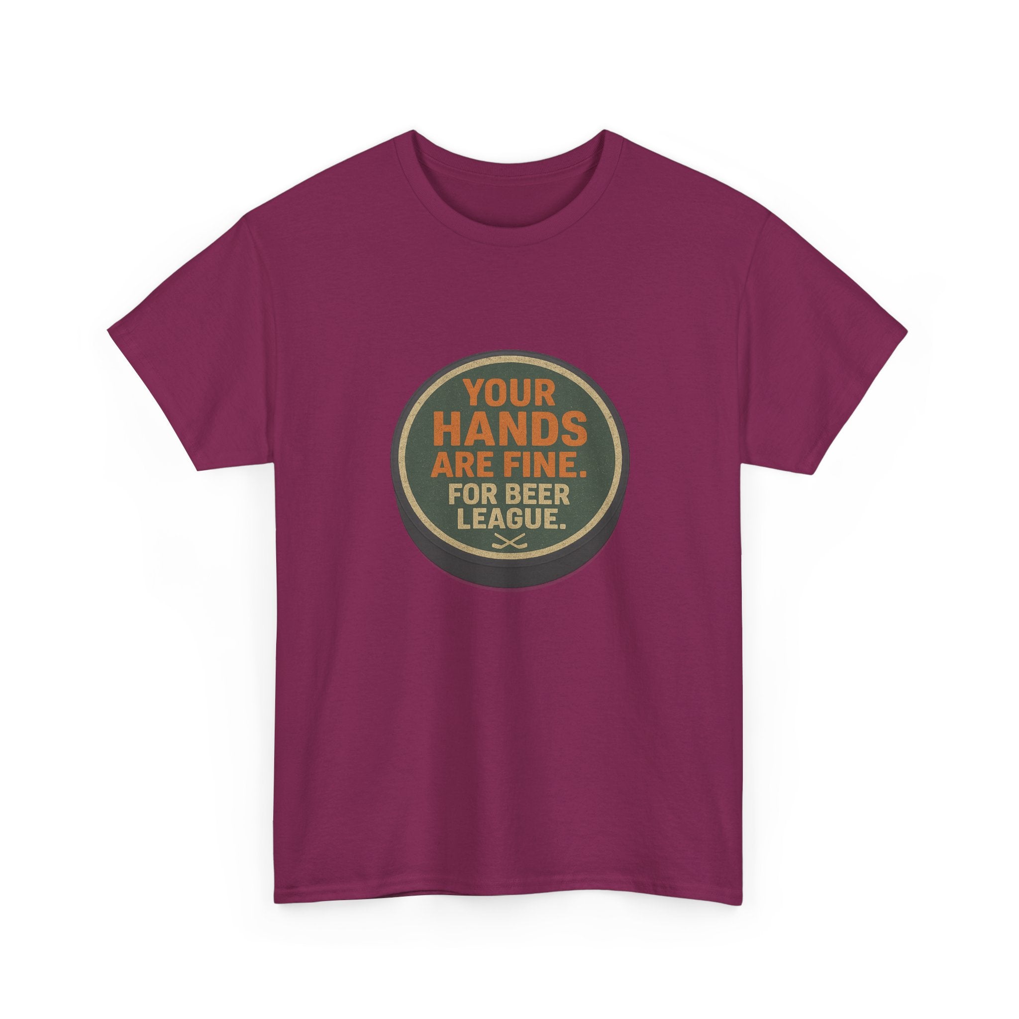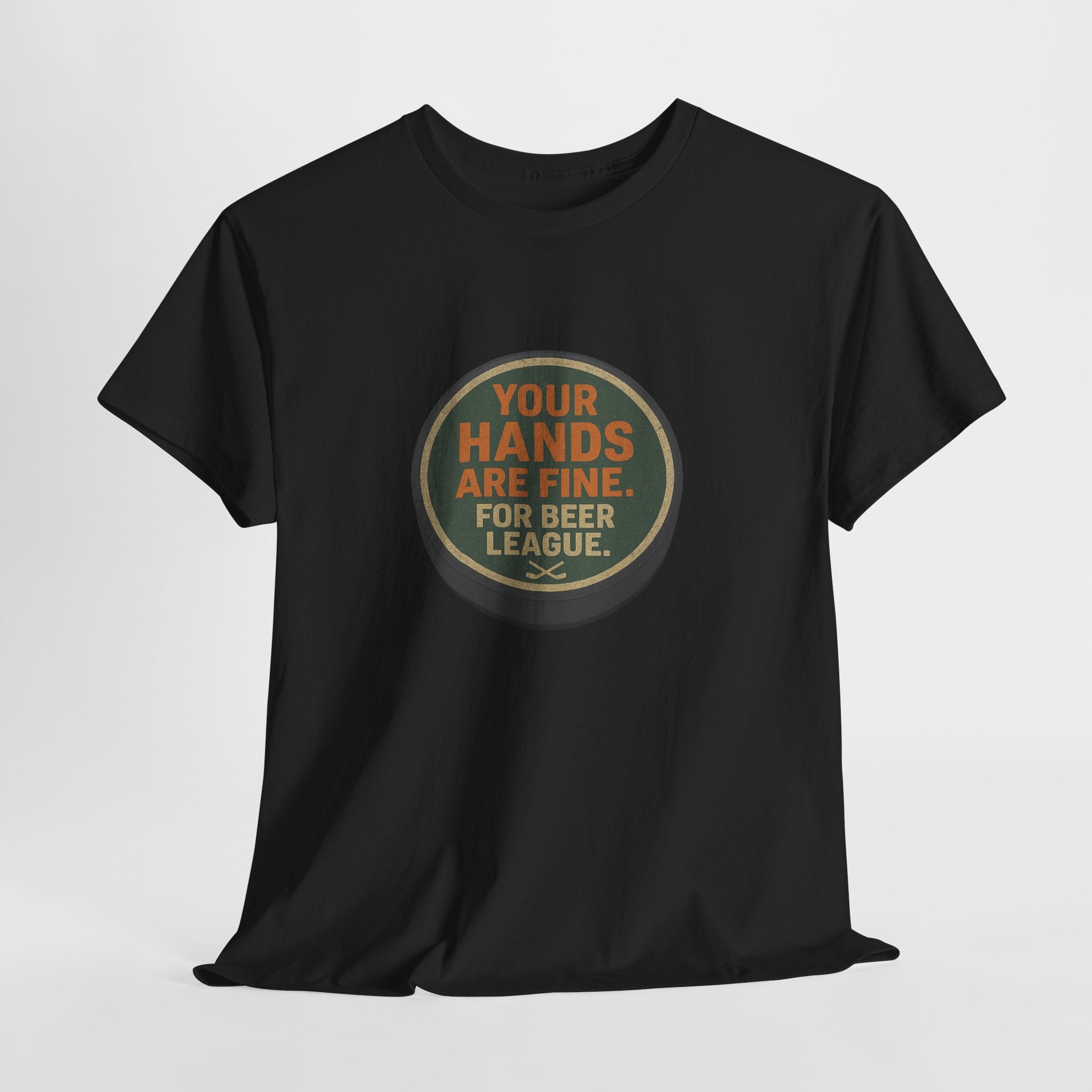 Your Hands Are Fine. For Beer League. – the ultimate backhanded compliment for recreational hockey players everywhere. This design delivers a playful jab at skill levels with the kind of humor only hockey folks truly appreciate. Perfect for anyone who's heard (or delivered) this classic chirp in the dressing room or on the bench. Celebrate the competitive spirit and self-aware banter that makes beer league hockey so much fun. Wear it as a badge of honor or a gentle reminder to keep practicing.