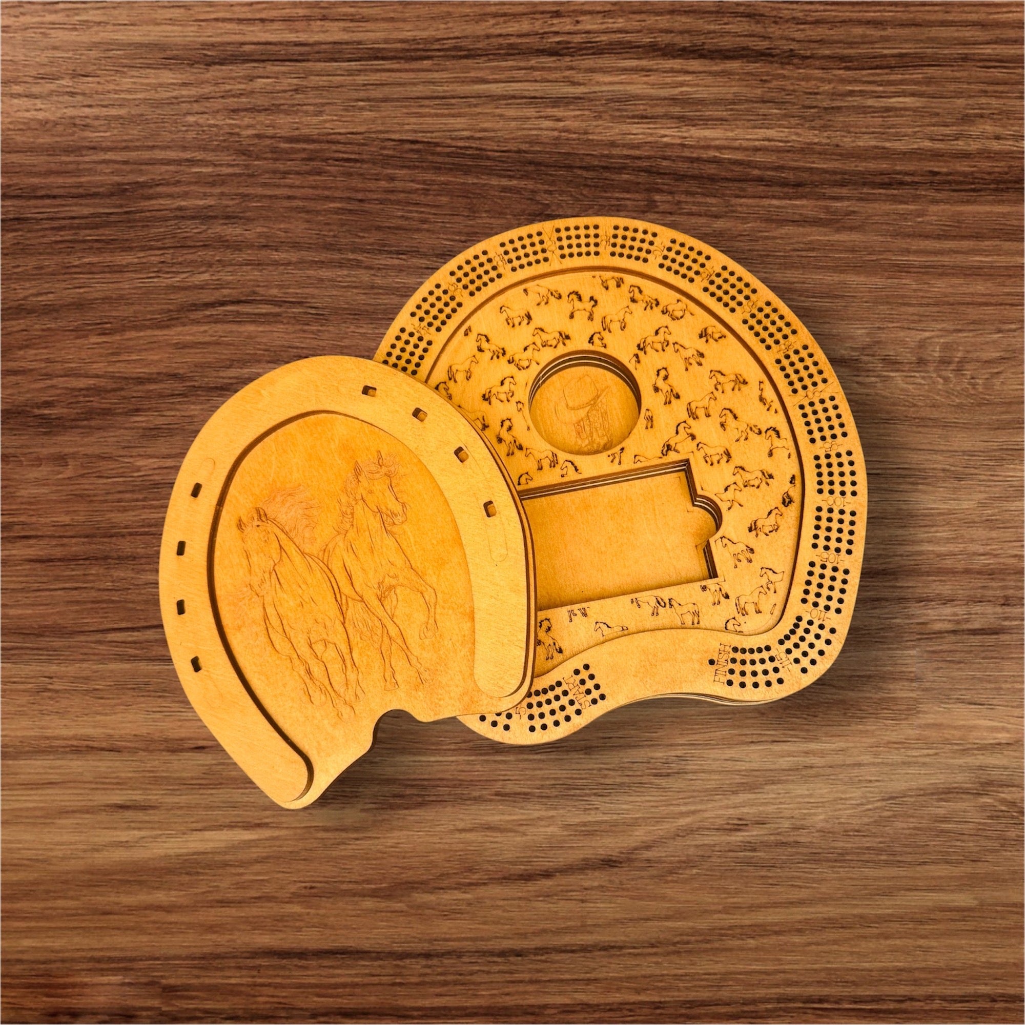 Bring a touch of rustic charm and western spirit to your game nights with our Horseshoe Cribbage Board. Handcrafted with precision, this unique cribbage board is shaped like a horseshoe and features beautifully engraved horse designs that capture the elegance and power of these majestic animals.
