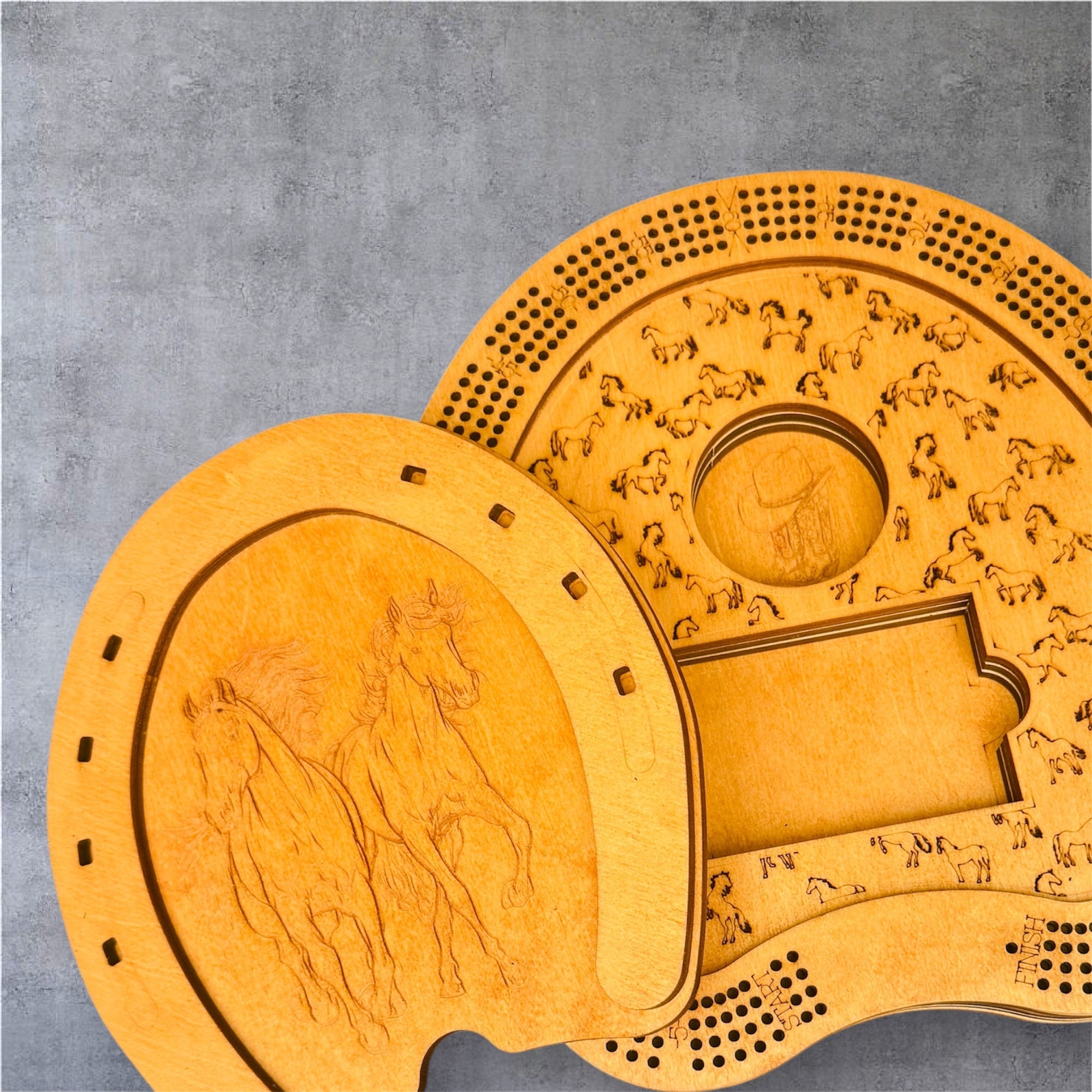 Designed not only for style but also functionality, this board includes a built-in storage compartment for cards and pegs, making it the perfect all-in-one travel set. Whether you’re a cribbage enthusiast, a horse lover, or simply looking for a meaningful gift, this board is sure to impress.
