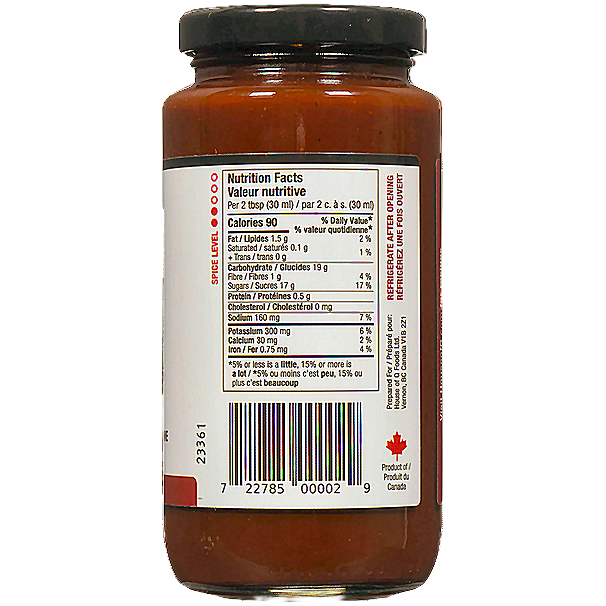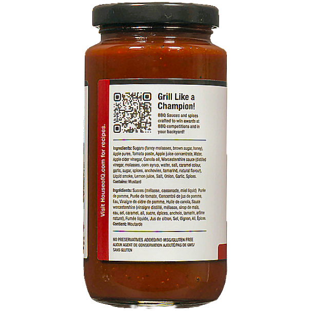 Sugars (fancy molasses, brown sugar, honey), Apple puree, Tomato paste, Apple juice concentrate, water, Apple cider vinegar, Canola oil, Worcestershire sauce (distilled vinegar, molasses, corn syrup, water, salt, caramel colour, garlic, sugar, spices, anchovies, tamarind, natural flavour), Liquid smoke, Lemon juice, Salt, Onion, Garlic, Spices.