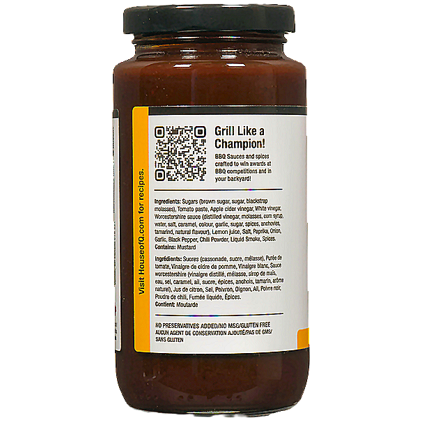 Sugars (brown sugar, sugar, blackstrap molasses), Apple cider vinegar, Tomato paste, White vinegar, Worcestershire sauce (distilled vinegar, molasses, corn syrup, water, salt, caramel, colour, garlic, sugar, spices, anchovies, tamarind, natural flavour), Lemon juice, Salt, Paprika, Onion, Garlic, Black Pepper, Chili Powder, Liquid Smoke, Spices (contains mustard).
