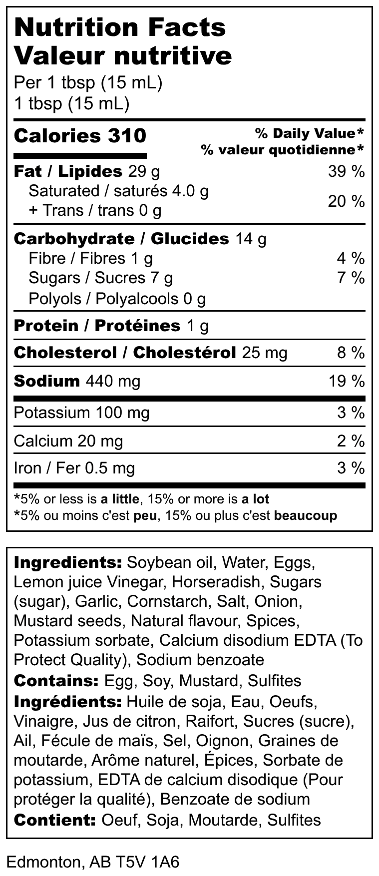 Ingredients: Huile de soja, Eau, Oeufs, Vinaigre, Jus de citron, Raifort, Sucres, Ail, Fécule de maïs, Sel, Oignon, Graines de moutarde, Arôme naturel, Épices, Sorbate de potassium, EDTA de calcium disodique (Pour protéger la qualité), Benzoate de sodium