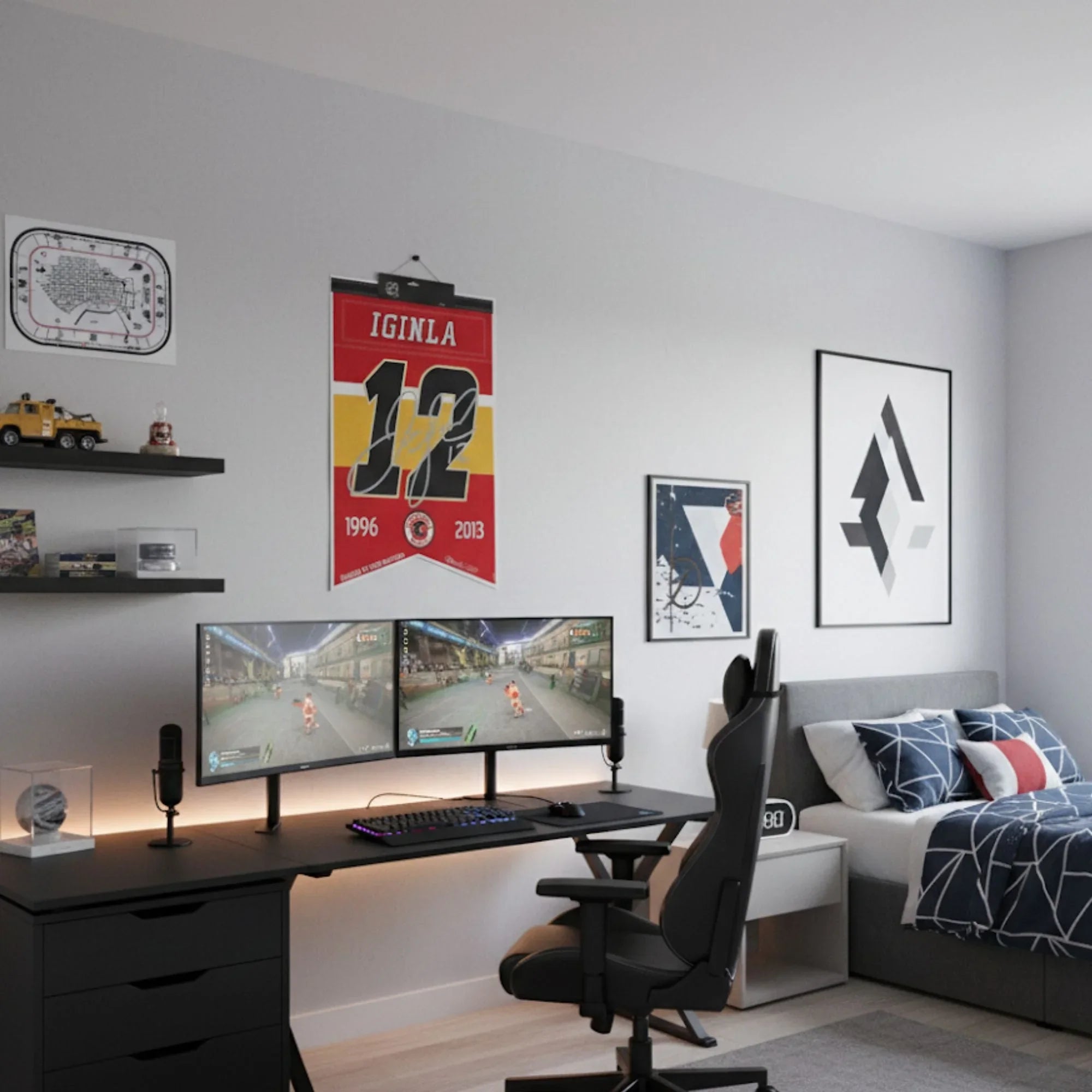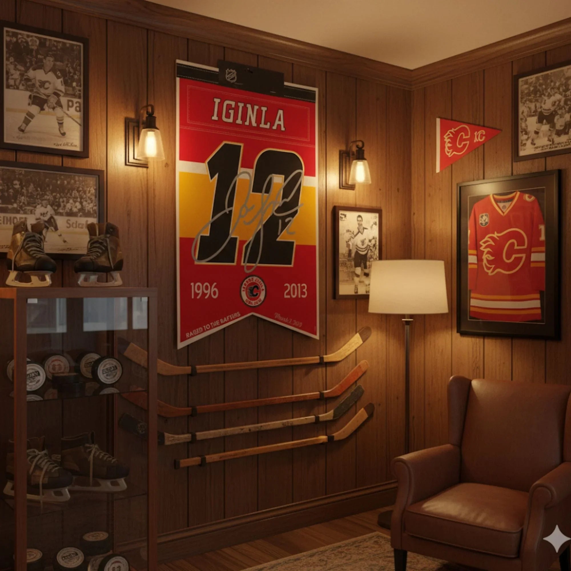 Celebrate Flames legend Jarome Iginla with this officially licensed NHL arena banner featuring his name, #12, and a printed facsimile signature. Designed in Calgary’s bold red and gold colors, it commemorates his storied career from 1996–2013 and his jersey retirement. A classic piece for any true Flames supporter.