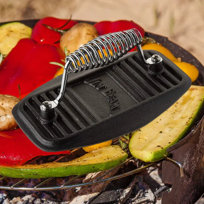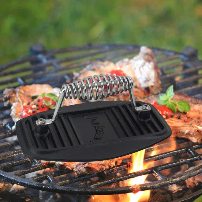 Crafted from durable cast iron, this meat press boasts a solid 9" x 5.5" x 4" size, making it versatile for use on any grilling surface. Its thoughtful design ensures comfortable handling, while the stainless steel accents add a touch of style and longevity to your outdoor cooking setup.
