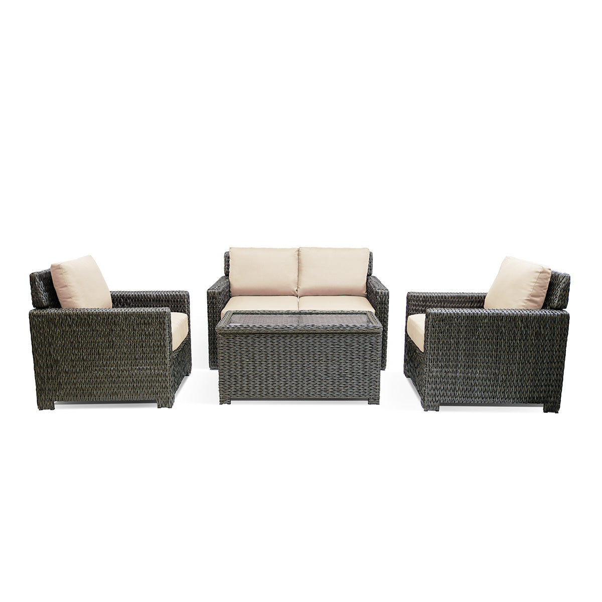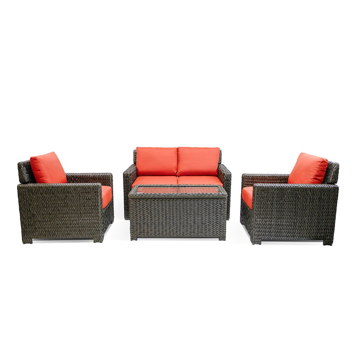 Glossy, dark brown wicker for a solid look with a modern feel. Deceptively compact, this conversational provides ample seating with an economical footprint so you can make the most of your space. Stretch out and relax on your own, or gather friends and family around this cozy set that adds a vibrant pop of colour.