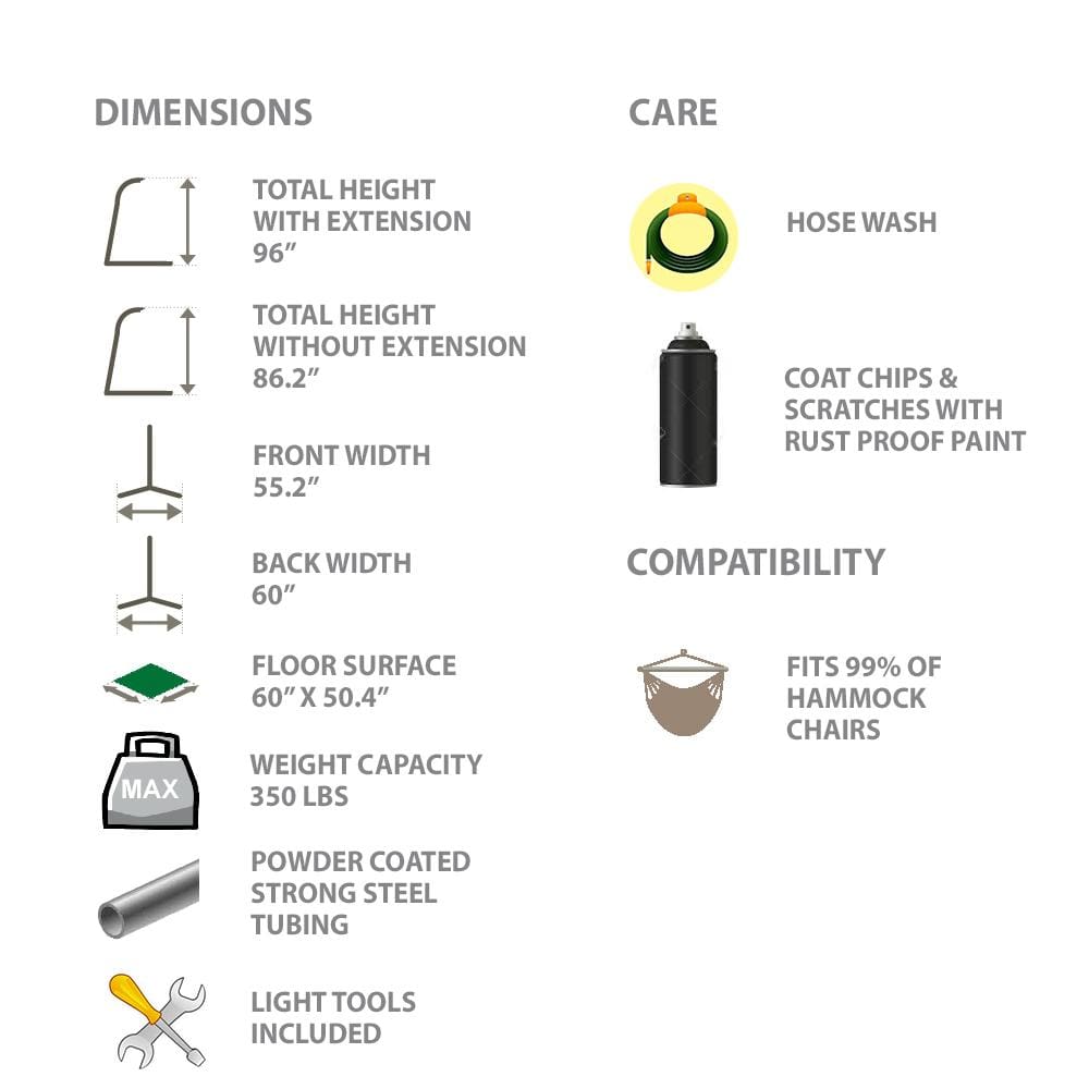 | What's Included | Mayan Hammock Chair with 39' Wood Bar + Hammock Chair Stand - 1 Extension - 2 S-hooks - 1 Chain |