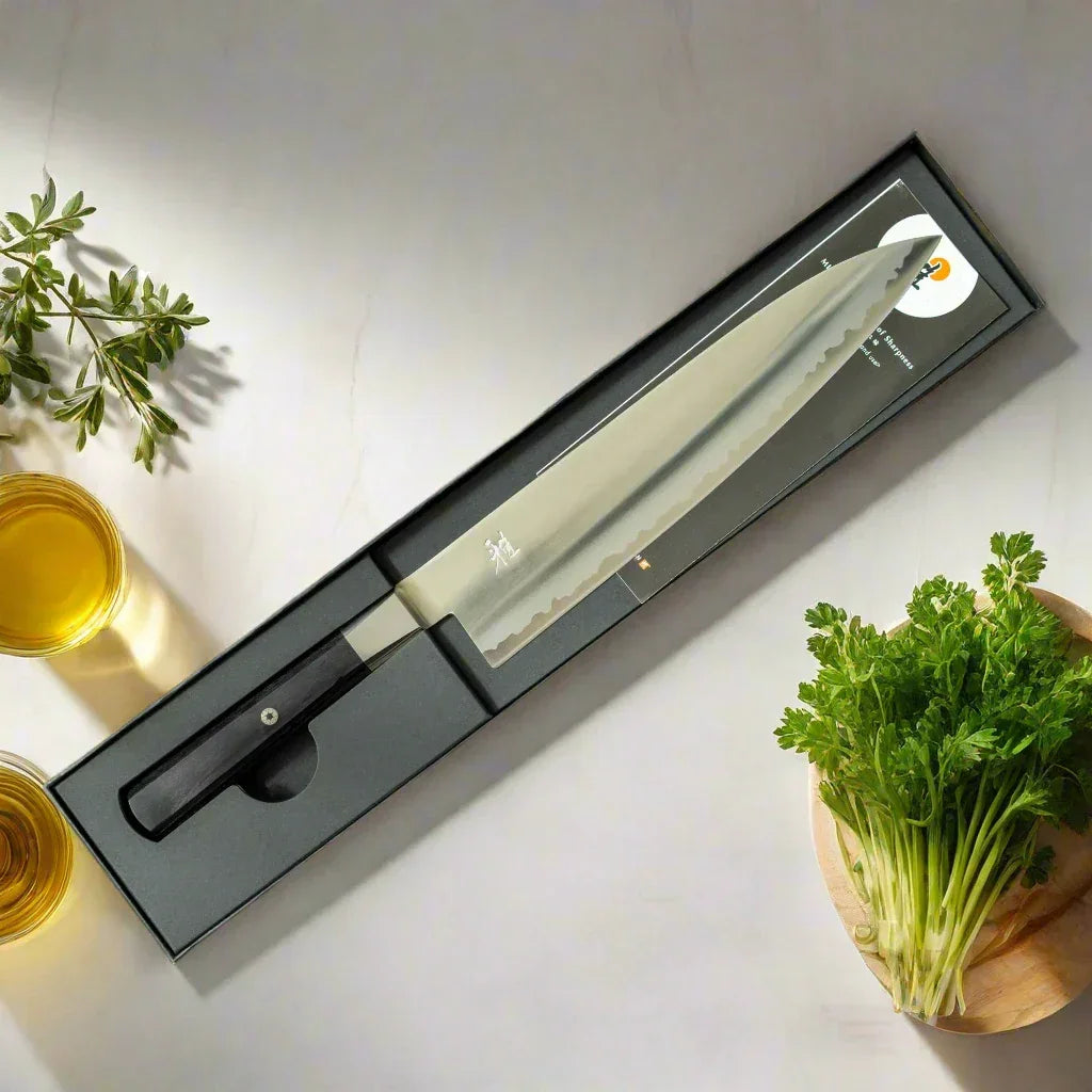Elevate your culinary experience with the MIYABI 4000 FC 9.5-Inch Gyutoh Knife, crafted for precision and performance. Handcrafted in Seki, Japan, this exceptional chef’s knife features a blade made from FC61 fine carbide stainless steel, offering remarkable 61 Rockwell hardness. The ice-hardened FRIODURx2 blade delivers outstanding durability, superior edge retention, and excellent corrosion resistance.