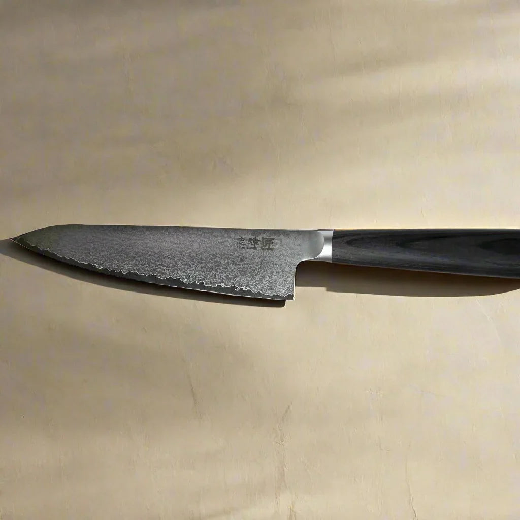 Crafted by master artisans in Seki, Japan, the blade is composed of 33 layers of high-carbon molybdenum vanadium steel (AUS8) and low-carbon SUS1A-1. This construction provides outstanding strength, corrosion resistance, and edge retention. The blade undergoes mirror polishing, followed by a matte finish, resulting in a soft, understated luster that highlights its refined craftsmanship.