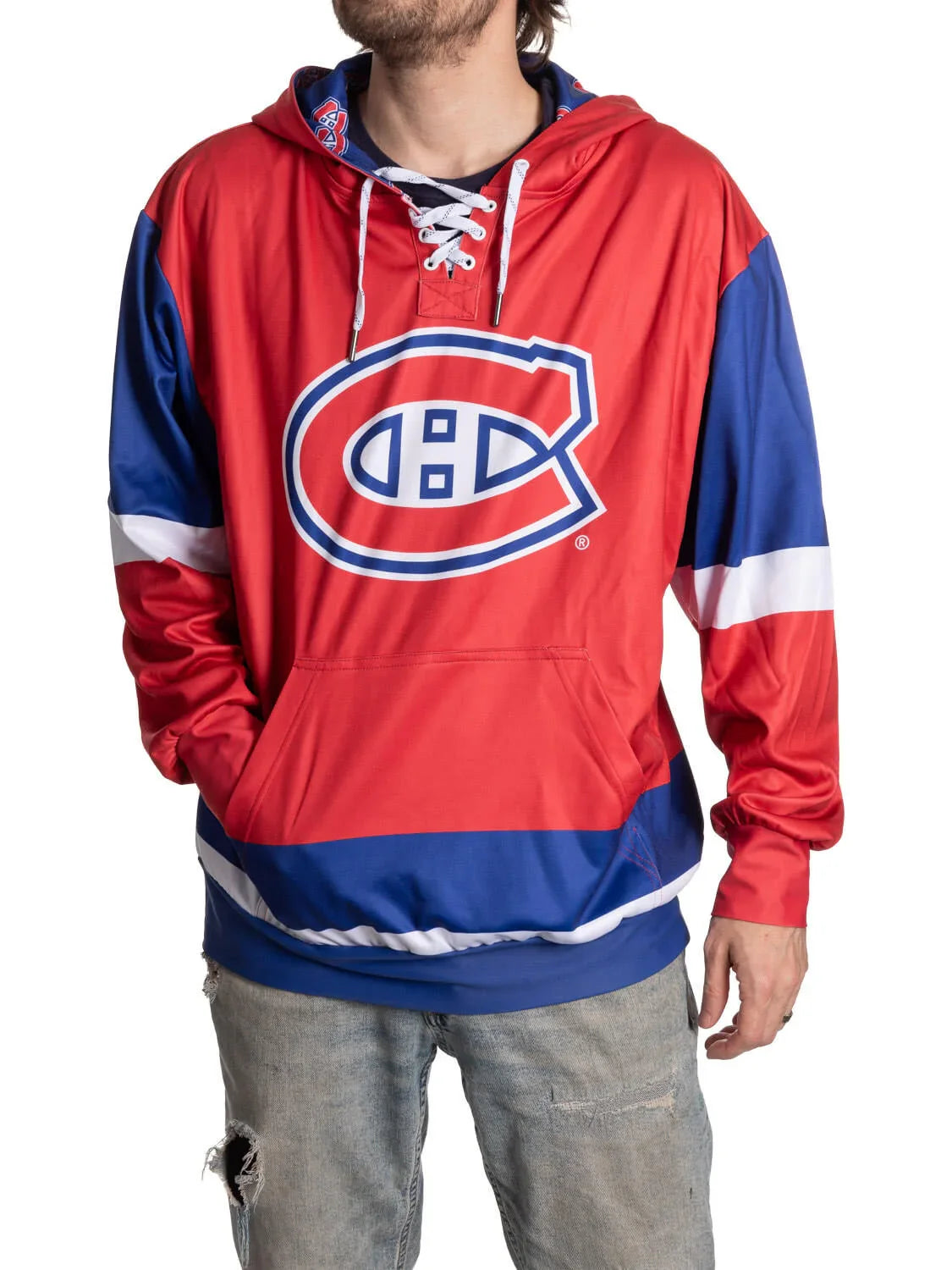 Lace up in style this season with our new Official Licensed NHL Montreal Canadiens Hockey Lace Hoodie. Styled in Montreal Canadiens team colours, this hoodie shows off your Canadiens pride in style!