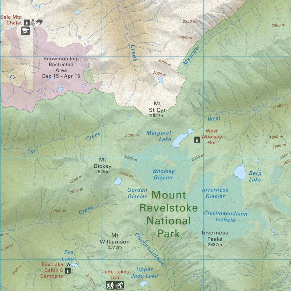 Covering Mount Revelstoke National Park and the surrounding area, this British Columbia topographic recreation map highlights all the access roads, backcountry huts and cabins, campgrounds, trails for hiking, horseback riding, mountain biking, cross-country skiing and snowshoeing, fishing rivers and lakes, rock climbing areas, viewpoints, waterfalls and more! This Adventure map features our industry-leading topographic contours and relief shading and includes the areas of Eva Lake, First Footsteps Trail, Giant Cedars Boardwalk Trail, Illecillewaet River, Inverness Glacier, Jade Lake, Lake Revelstoke, Margaret Lake, Meadows in the Sky Parkway, Mount Revelstoke, Revelstoke, Silvertip Canyon Falls, Woolsey Creek and more!