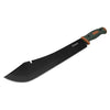 Outdoor Life Camping Machette, 16 inch overall. 11 inch satin finish 65MN steel blade with 11 inch cutting edge. Orange nylon handle with green rubber overmold. Lanyard hole clip. Rigid Nylon Reinforced Nylon Fiber Sheath