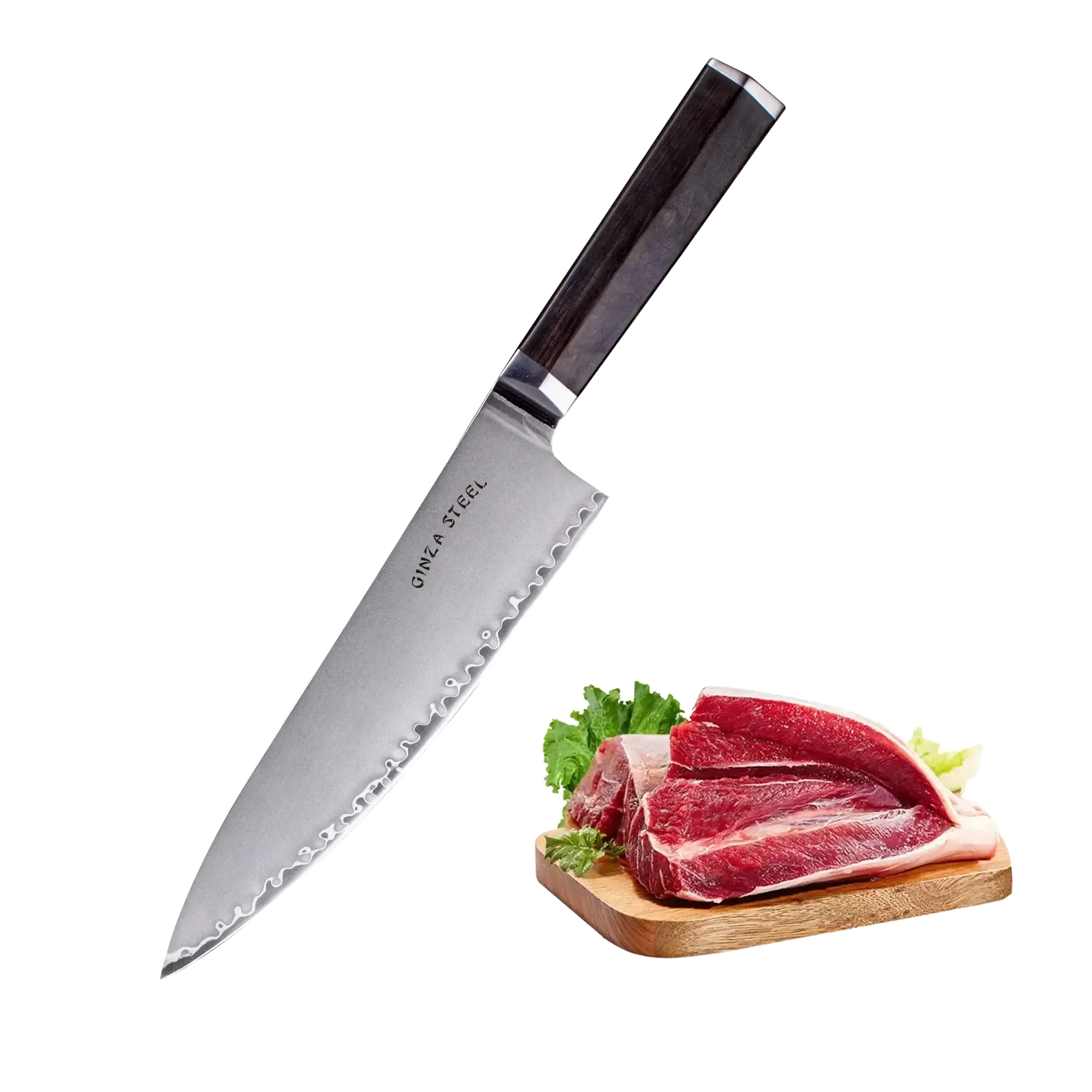The Ginza Steel PORTIA 20 chef knife is high-quality with a VG10 steel blade. The blade is known for its sharpness, durability and corrosion resistance, making it ideal for cutting and slicing various ingredients. The handle of this knife is made of ebony wood, which provides a comfortable and secure grip. The combination of the VG10 blade and ebony handle makes this chef knife a stylish and practical addition to any kitchen.